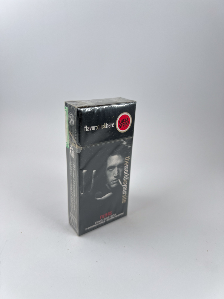 Black, matte effect package with contrasting design. On the front side – a stylized male face, extending his hand towards the viewer, next to a vertical inscription “"the world is your site"“. Above in the red circle – classic Lucky Strike logo, and next to it the slogan “"flavor:clickhere"“, indicating the theme of the series – an online, modern image aimed at a young audience. On the side – the website address www.luckyflavor.com, the green Indonesian excise stamp remains on the back. Visually, the package is distinguished by the stylistics of technological minimalism, typical of the early 2000s.