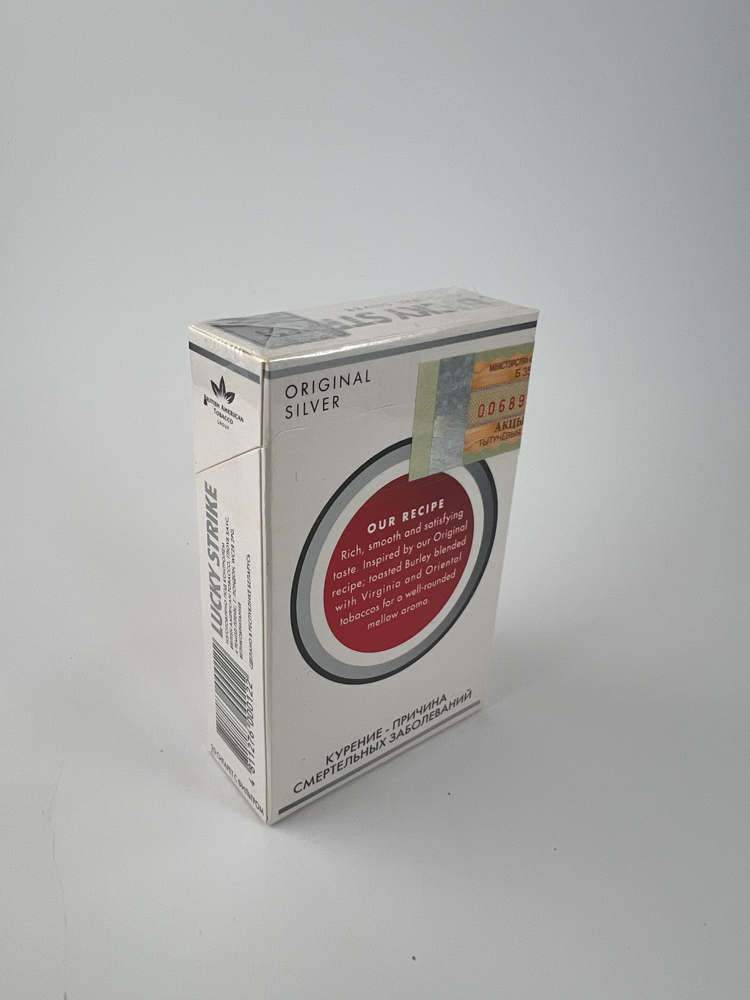 Description: This pack of Lucky Strike Original Silver cigarettes is a variation of the classic Lucky Strike design for the Russian market. The front features the iconic red logo with the words "IT'S TOASTED", which refers to the unique tobacco roasting process. The text "Original Silver" is visible on the top, and the British American Tobacco symbol is on the side. The back side features a description of the compatible blend of Burley, Virginia and Oriental tobaccos. Russian-language warnings about the dangers of smoking indicate that this is a local edition. The pack is unopened, with a Russian excise stamp.