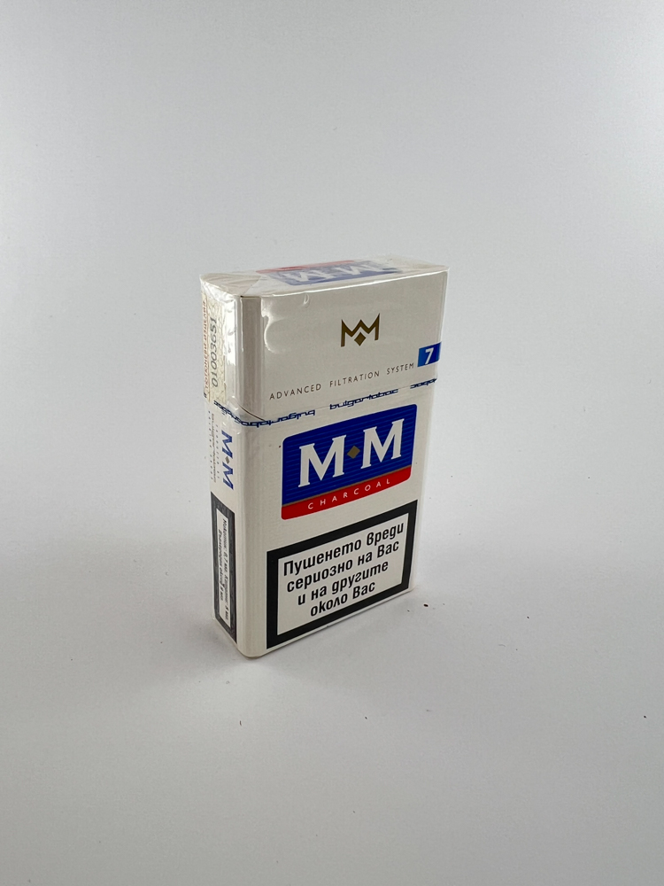 This M M Charcoal bag represents the high filtration quality segment – a crisp white package with a dark blue M·M logo strip, the wording „Charcoal“ and an additional high filtration system („Advanced Filtration System“). On the front side, a Bulgarian warning about the damage is visible: „"Pusheneto is seriously worth it to you and to others around you"“. Package – original, undamaged, with excise sticker on top. Condition – excellent, unbent lid, hermetically sealed.