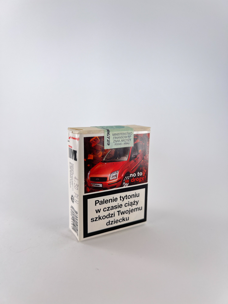 Description: This is a special edition of the popular M Mocne cigarettes – „Mocne na lato!“ (lit. „Strong for the summer!“), with a clearly marked seasonal advertising campaign. The front side is dominated by the graphic „M“ logo and slogan in red, and the back side has an interesting advertising illustration with a red Ford Fusion car and the slogan „No to w drogė!“ (lit. „Well, on the road!“), which suggests that it was part of a promotional campaign or lottery. The packaging is in excellent condition, with a 2004 excise stamp and standard warnings.