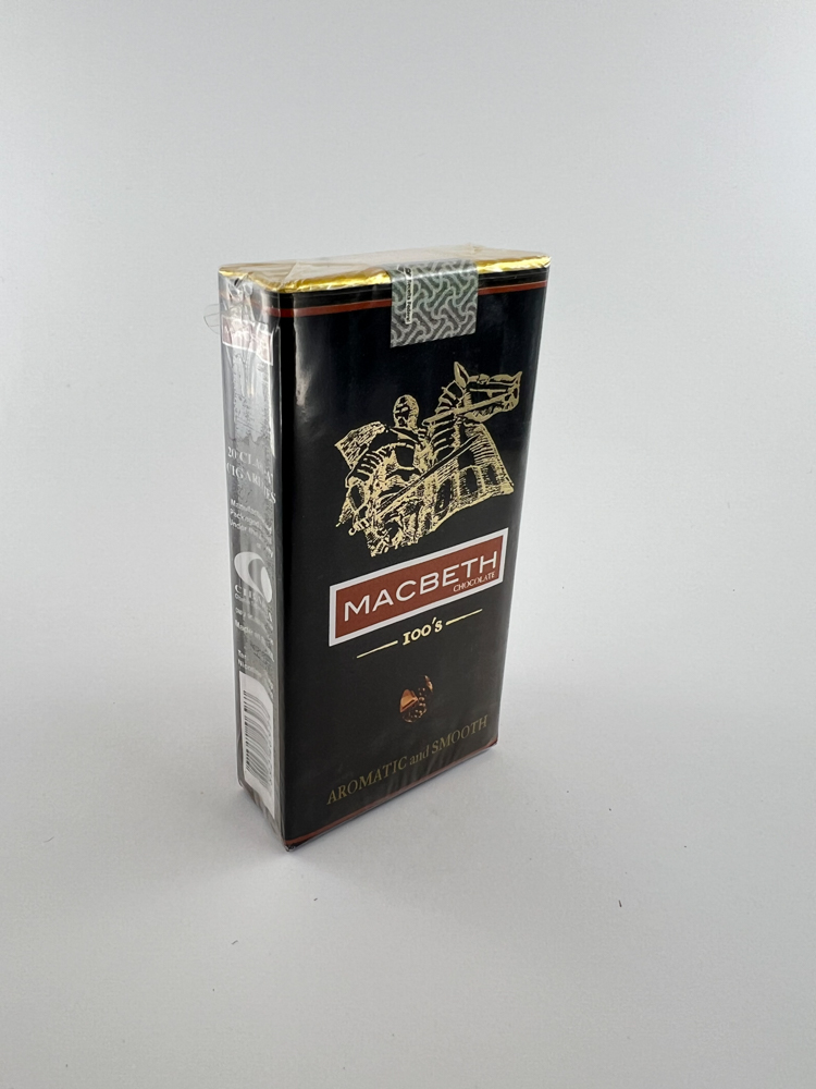 Macbeth "Chocolate" 100's are flavored cigarettes in a uniquely designed package. The black background with a golden knight image, a red-brown logo and a chocolate symbol at the bottom conveys the impression of luxury and exclusivity. The bottom part indicates the fragrant and smooth type of tobacco - "Aromatic and Smooth". The package is intact, with a golden top and two excise seals indicating the country of origin and tax payment.