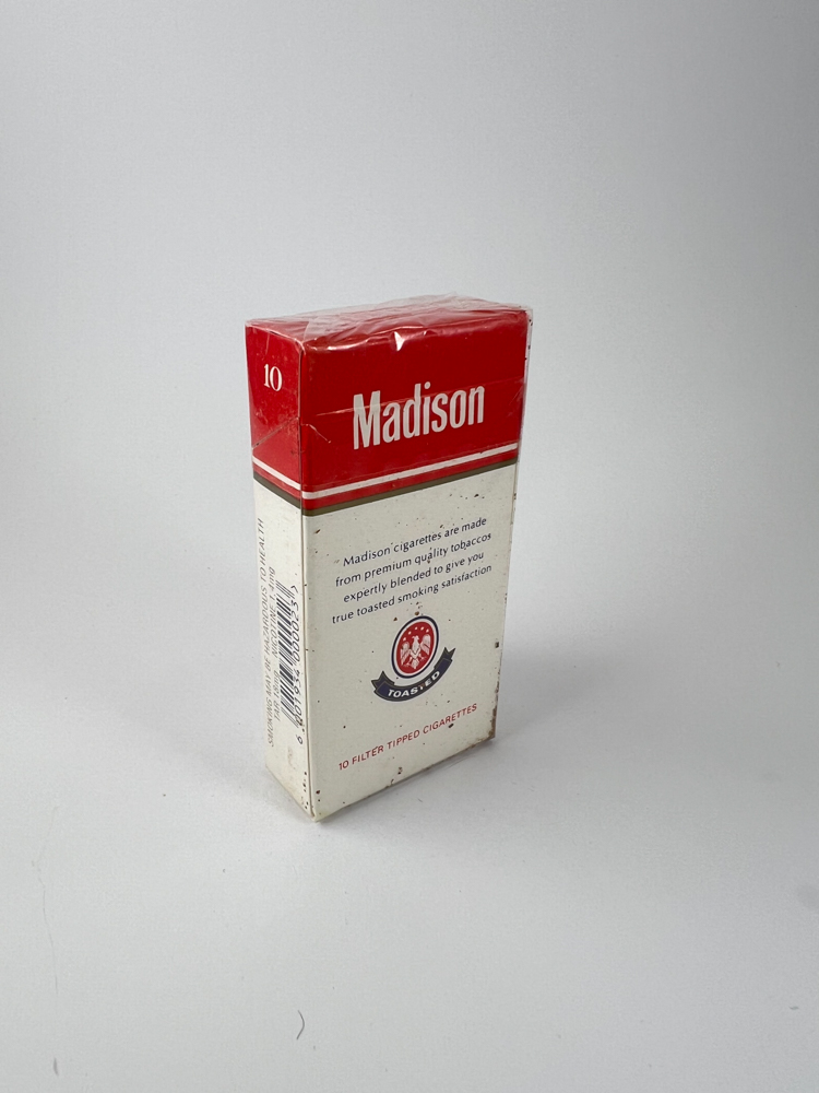 Description: This pack of Madison Toasted cigarettes stands out for its classic design combination – a bright red background with a white Madison logo at the top, and a white background with a coat of arms with an eagle and the word „Toasted“ at the bottom. The sides and back of the pack explain that the cigarettes are made from high-quality tobacco, which gives them a „toasted“ taste. The compact format of 10 cigarettes makes this pack an exclusive collector's item.