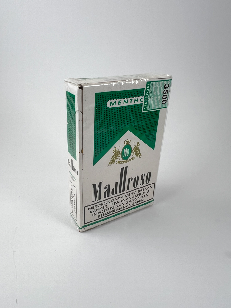 Madlroso Menthol – mažiau žinomas indonezietiškas cigarečių prekės ženklas. Pakelis talpina 14 filtrinių cigarečių – tai netipiškas formatas, nes dažniausiai sutinkami 12 arba 16 vnt. indonezietiški pakeliai. Dizainas baltai-žalias, su centriniu užrašu „Madlroso“ ir ženkleliu „MD“ viršuje. Viršutinėje dalyje išskirtinai pažymėta „Menthol“. Nugarinėje pusėje – sveikatos įspėjimas, o šone yra indonezietiška akcizinė banderolė. Pakelis neatidarytas, su originaliu celofanu, labai geros būklės.
