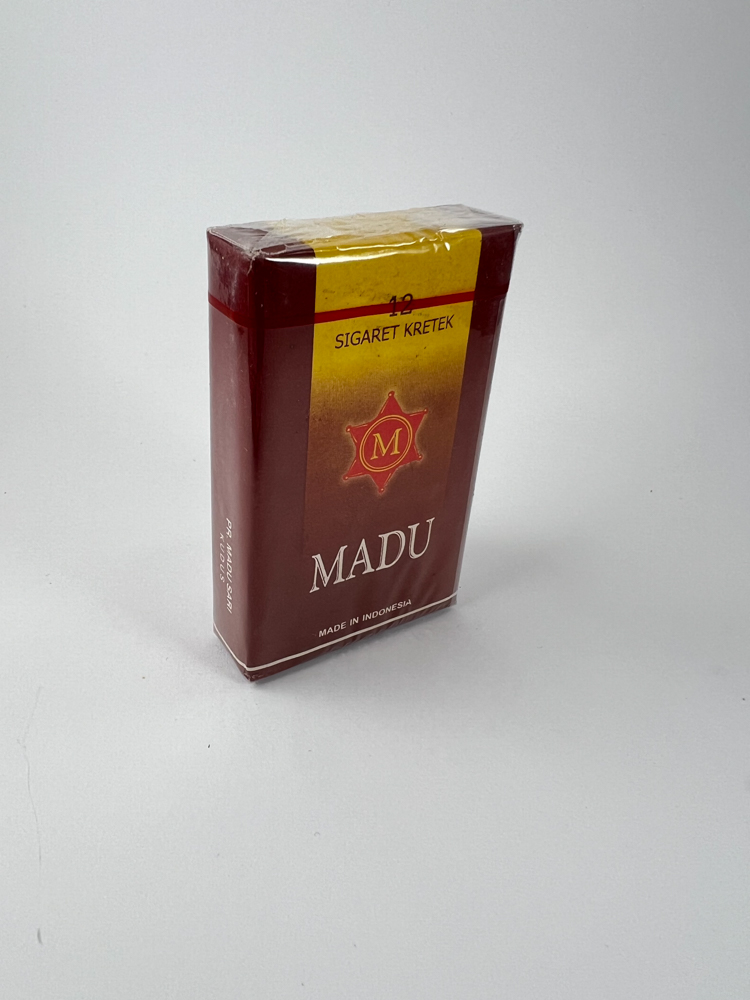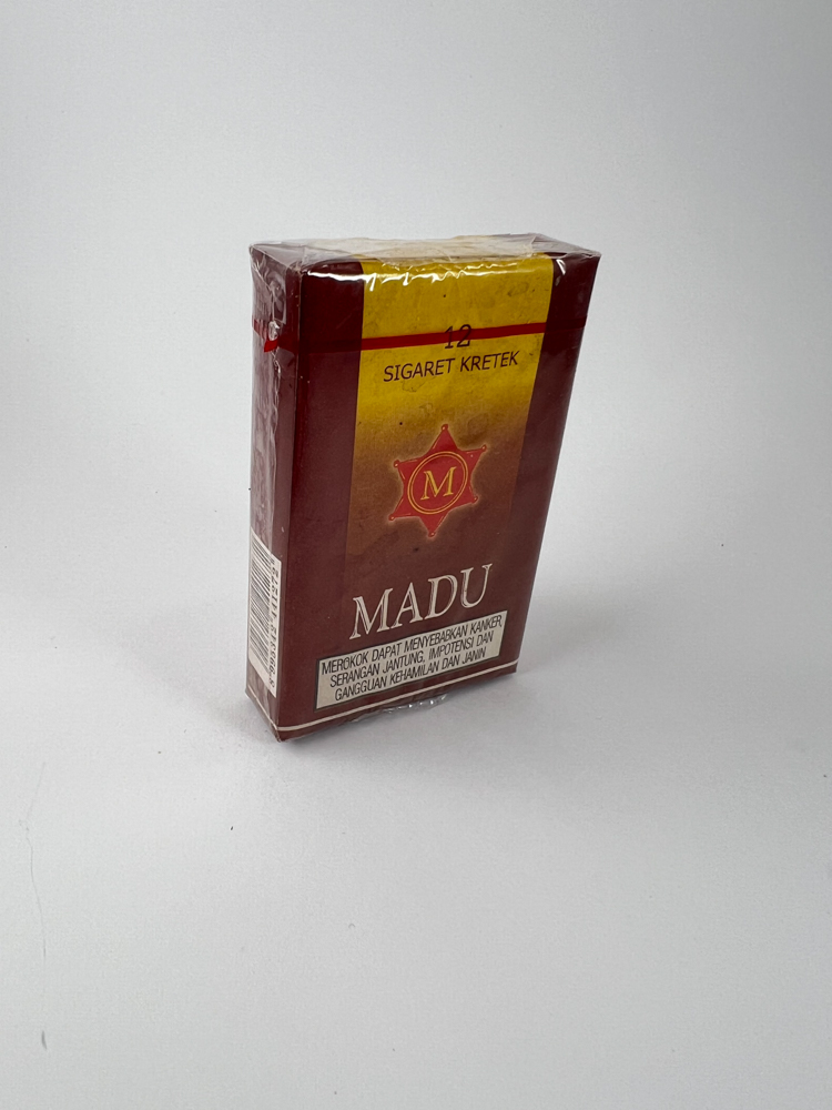 Madu („medus“ indoneziečių kalba) yra tradicinės indonezietiškos kretek cigaretės, kurių sudėtyje gali būti saldesnis aromatas, primenantis medų. Pakuotė vyrauja raudonos ir geltonos spalvų gama su „M“ simboliu žvaigždės formos emblemoje. Viršuje ir nugarinėje pusėje aiškiai nurodyta „12 Sigaret Kretek“. Apatinėje dalyje įspėjimas indoneziečių kalba apie rūkymo žalą. Pakelis neatidarytas, originali plėvelė vietoje, būklė gera, nors viršutinėje dalyje matomas nedidelis plėvelės įtempimas.