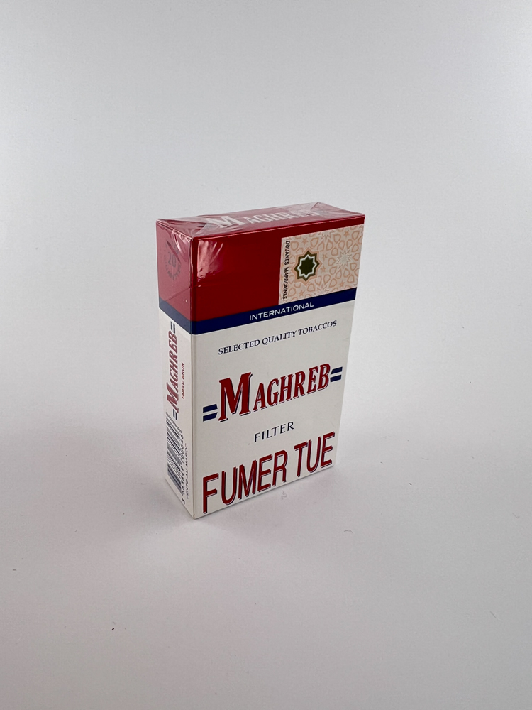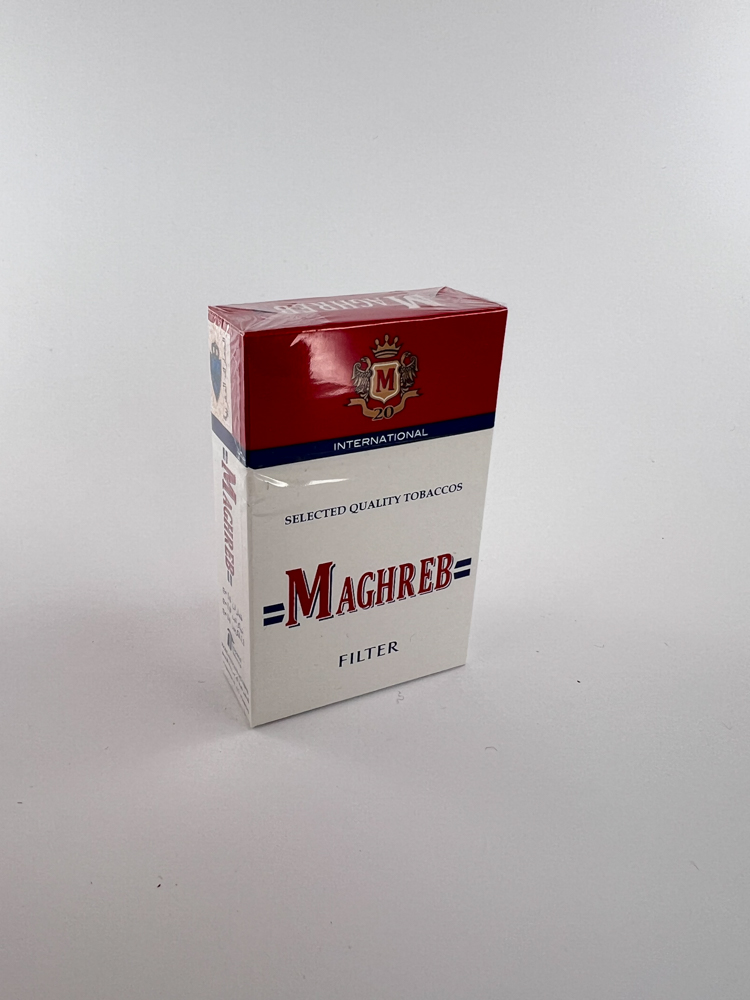 Maghreb Filter is a Moroccan cigarette brand that features the classic American Blend style. The pack features a contrasting red and white color scheme with blue accents and the usual warning "Fumer Tue" ("Smoking Kills"). The pack features a Moroccan customs sticker indicating that the product is intended for the local or regional market. The top features a stylized logo with the coat of arms and the words "INTERNATIONAL". The design is similar to that of better-known brands, but it is a regionally distributed product, most commonly found in North Africa.