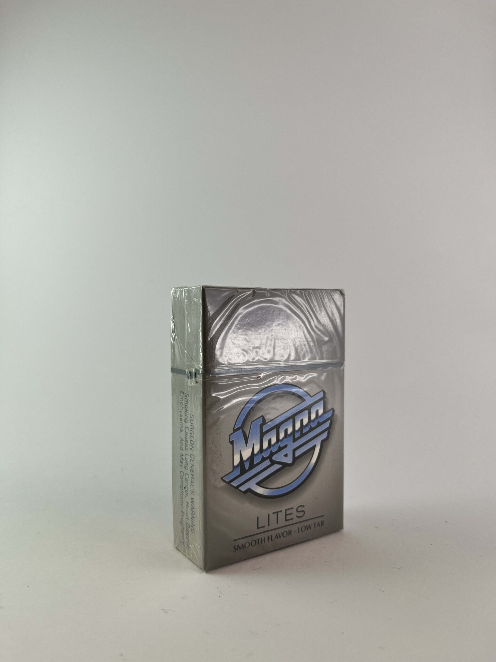 Description: This Magna Lites cigarette pack features a modern and simple design with a metallic effect that gives the pack a contemporary feel. The pack features a warning about the dangers of smoking, typical of the US market at the time. The pack is sealed in its original plastic, which increases its collector's value.