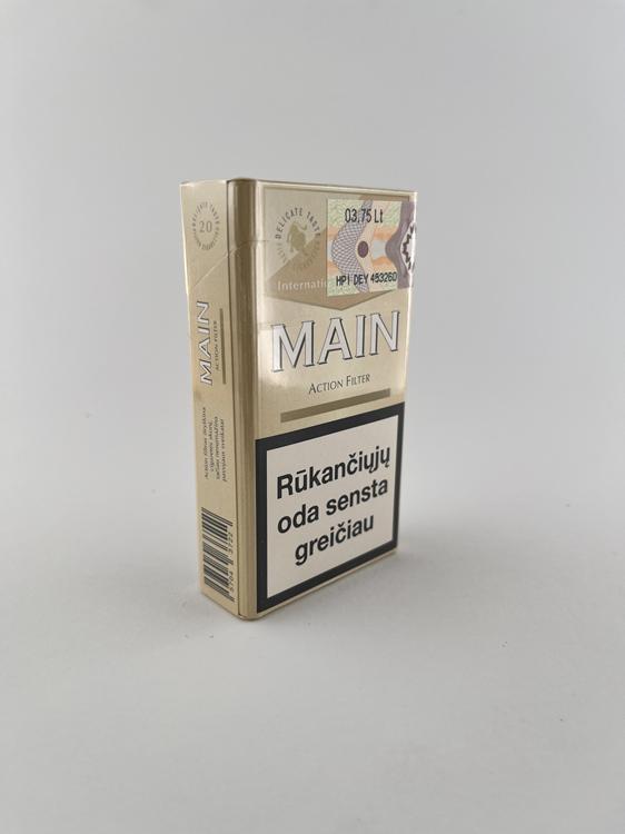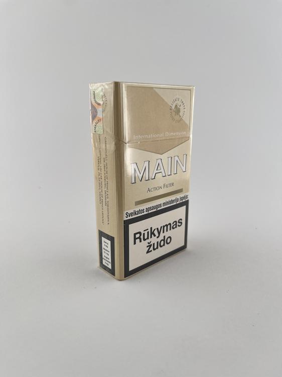 Aprašymas: Šis MAIN „Action Filter“ cigarečių pakelis pasižymi auksinės spalvos dizainu su subtiliomis šviesiai rudos ir pilkos spalvos detalėmis. Priekinėje dalyje išryškintas „MAIN“ logotipas bei užrašas „International Dimension“, kuris buvo naudojamas kuriant tarptautinio prekės ženklo įvaizdį. Auksinis dizainas dažniausiai siejamas su „lights“ arba švelnesnio skonio segmentu. Pakelis skirtas Lietuvos rinkai, ką patvirtina lietuviški sveikatos įspėjimai bei akcizo banderolė su kaina litais (3,75 Lt). Dizainas atitinka pereinamąjį laikotarpį prieš standartizuotų pakuočių įvedimą Europos Sąjungoje. Pakelis išlaikęs gerą formą, spalvos ryškios, plėvelė nepažeista.