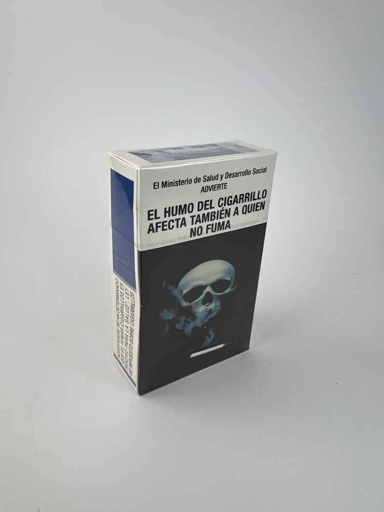 Description: This Marlboro Blue pack features a classic white background with a blue top and the words "Filter Cigarettes". It is a milder version of Marlboro, aimed at consumers looking for a milder taste. The front features the traditional Philip Morris crest. The back features a health warning in Spanish with a striking visual illustration of a skull: „"El humo del cigarette affects also a quien no fuma"“ („Cigarette smoke also affects non-smokers.“) The warning is marked with a sign from Venezuela’s Ministry of Health and Social Development, which clearly identifies the market.