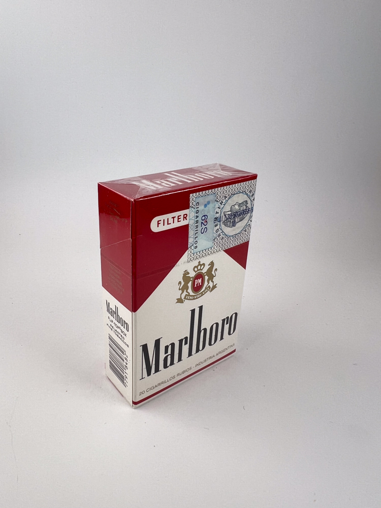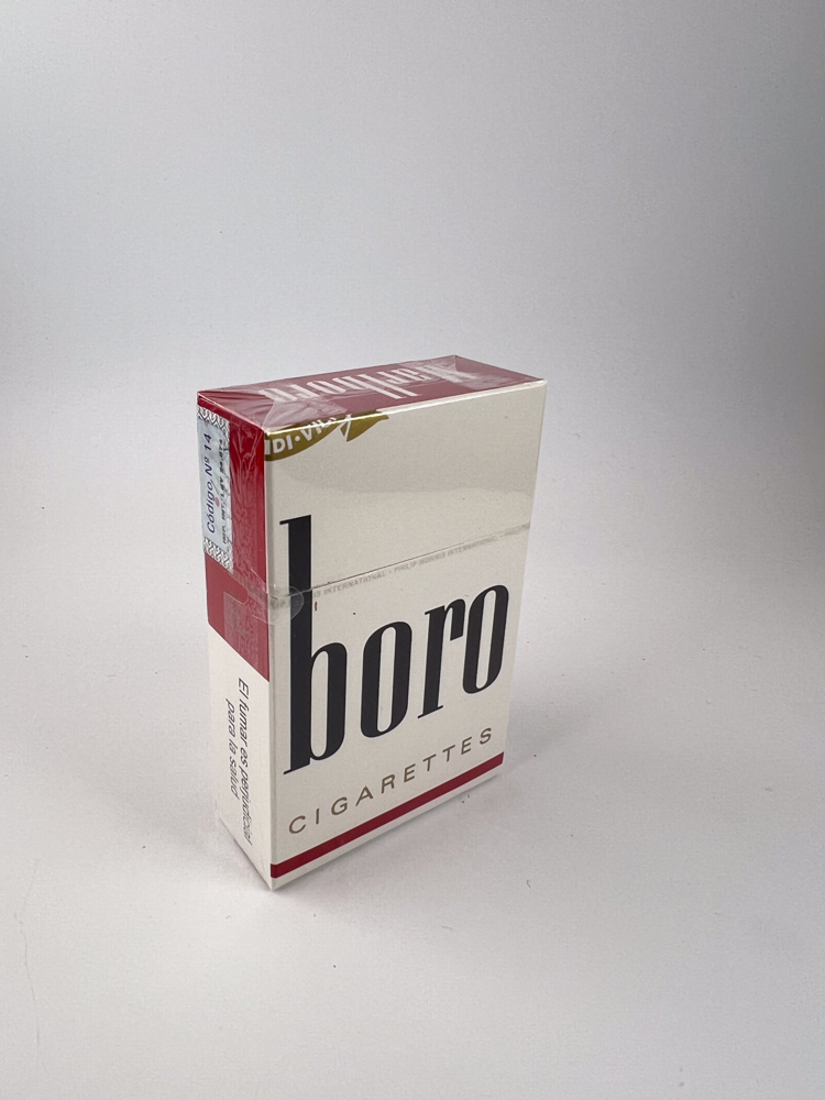 Exceptional and unusual Marlboro / Boro The pack is one of the most sought-after Argentine editions by collectors due to its paradoxical design. One side of the pack presents a minimalist version with a large "boro" inscription and the word Cigarettes bottom, done in a clean modern font. The other side is a classic Marlboro Filter Box design with a recognizable red-and-white triangle, the "PM" emblem and a red top.