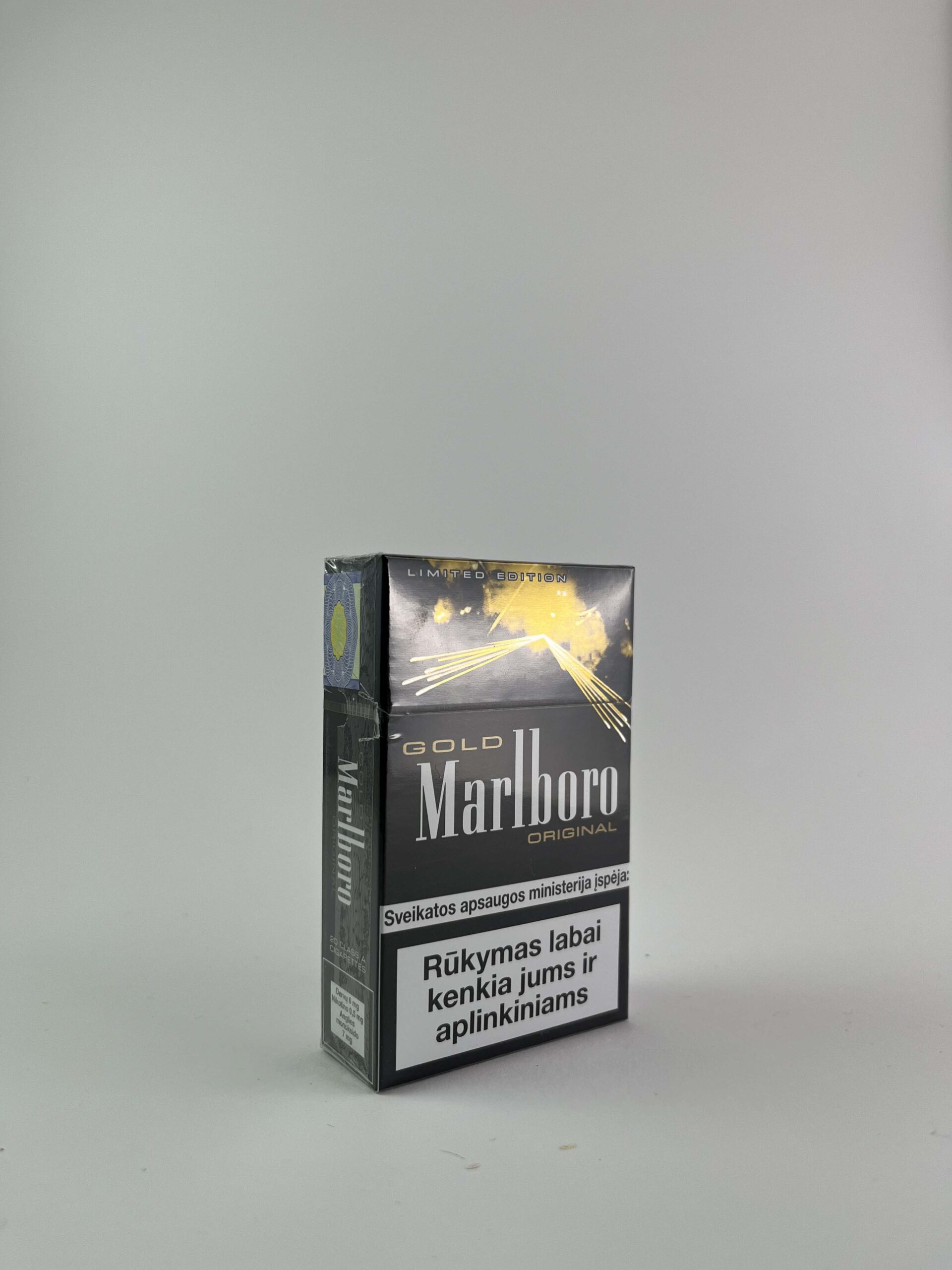 - Short description: Šis „Marlboro Gold“ yra riboto leidimo, išskirtinio dizaino su auksiniais elementais, kurie pabrėžia prabangą ir išskirtinumą. Riboto leidimo pakeliai dažnai gaminami kolekcionavimui ar ypatingoms progoms pažymėti, todėl šis dizainas gali būti retas ir vertingas kolekcininkų tarpe.