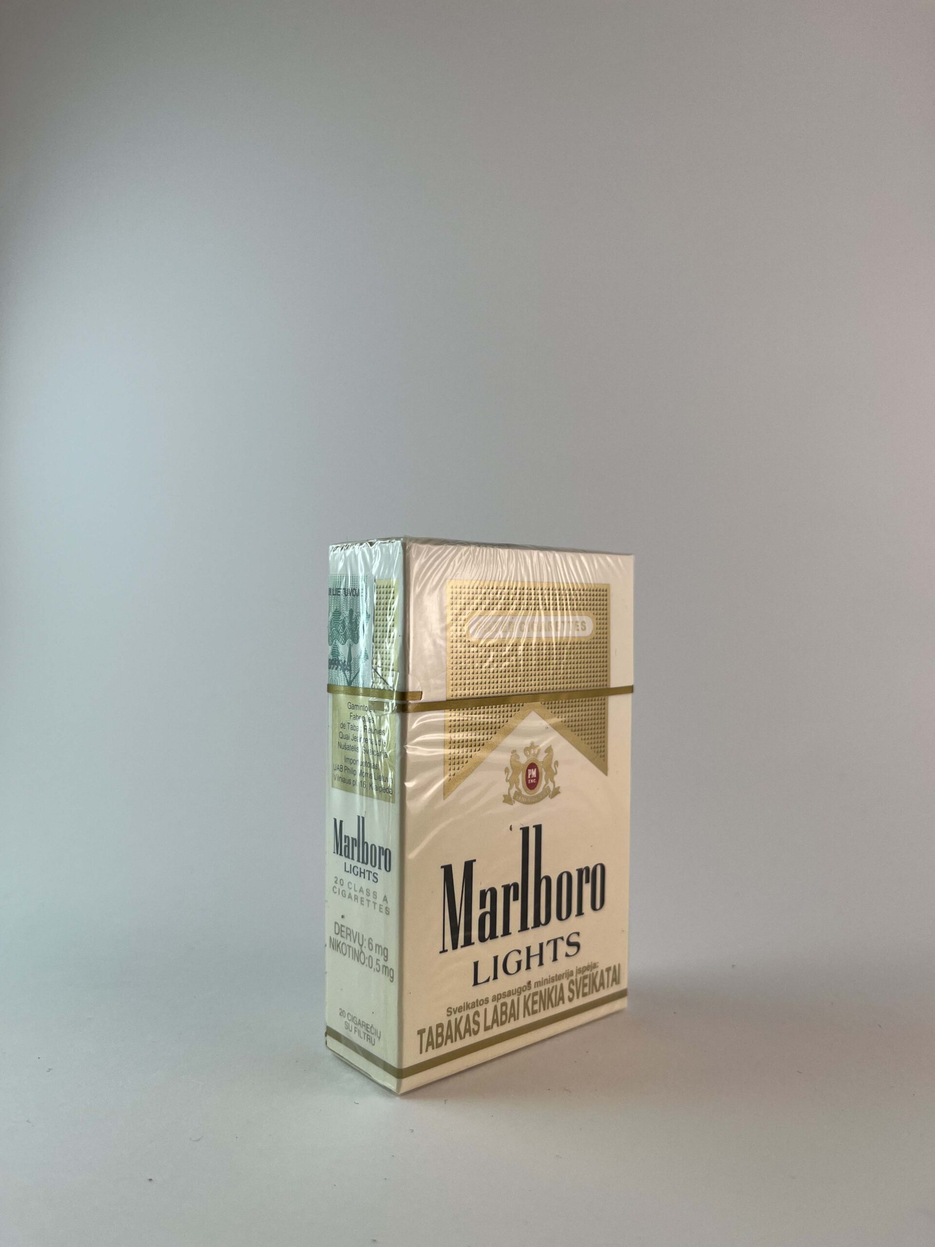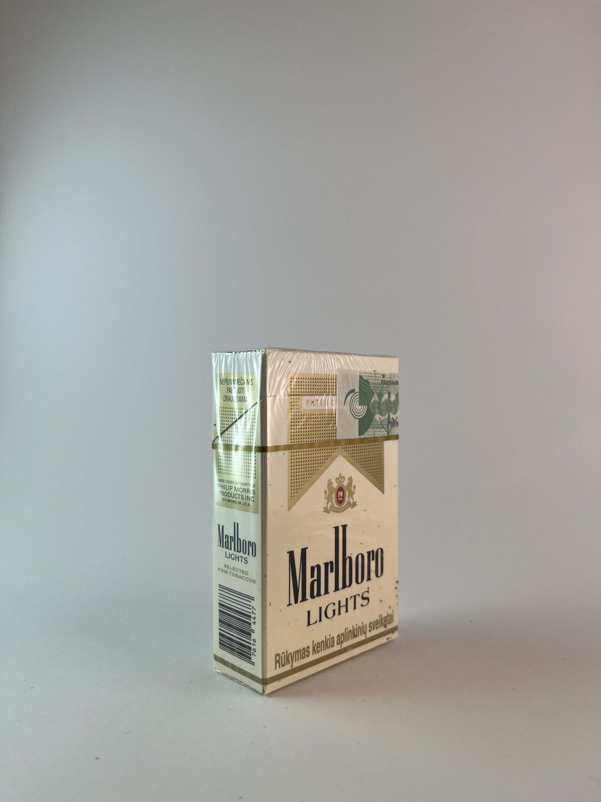 Description: The Marlboro Lights cigarette pack is known for its light, elegant appearance. The design retains the classic Marlboro look with gold accents and a logo that emphasizes quality. The warning about the dangers of smoking is clearly visible and attracts the attention of consumers. This model is popular with smokers who prefer milder tasting cigarettes.