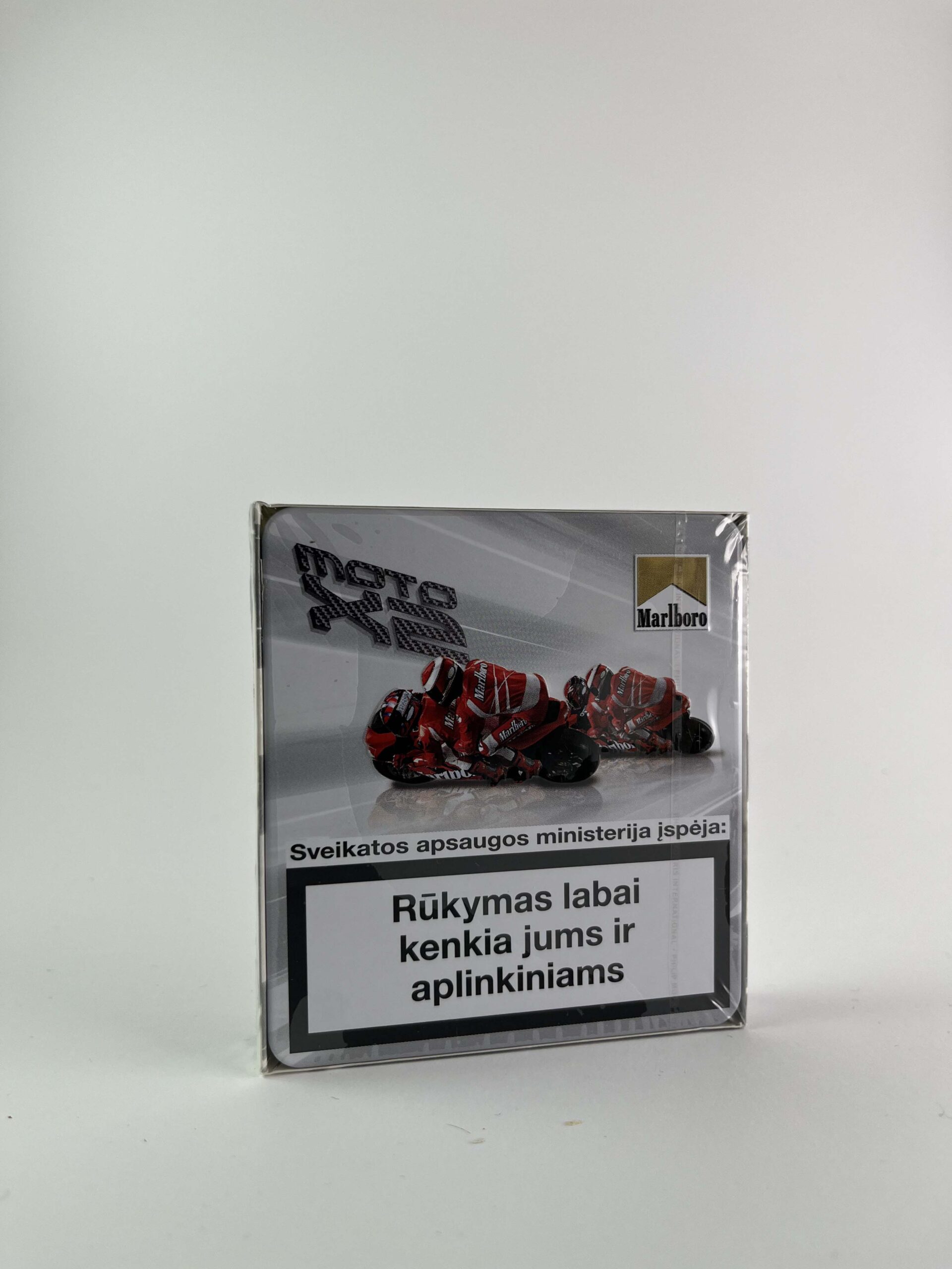 1. Description: Šis riboto leidimo „Marlboro Moto X2“ pakelis pasižymi unikaliu dizainu, kuris pabrėžia „MotoGP“ tematiką. Pagrindinėje pakelio pusėje vaizduojami raudonai apsirengę lenktynininkai motociklų lenktynėse, o ant viršaus – Marlboro logotipas auksine spalva. Įspėjimas apie rūkymo žalą užima didelę pakelio dalį, atspindint ES teisės aktų reikalavimus.