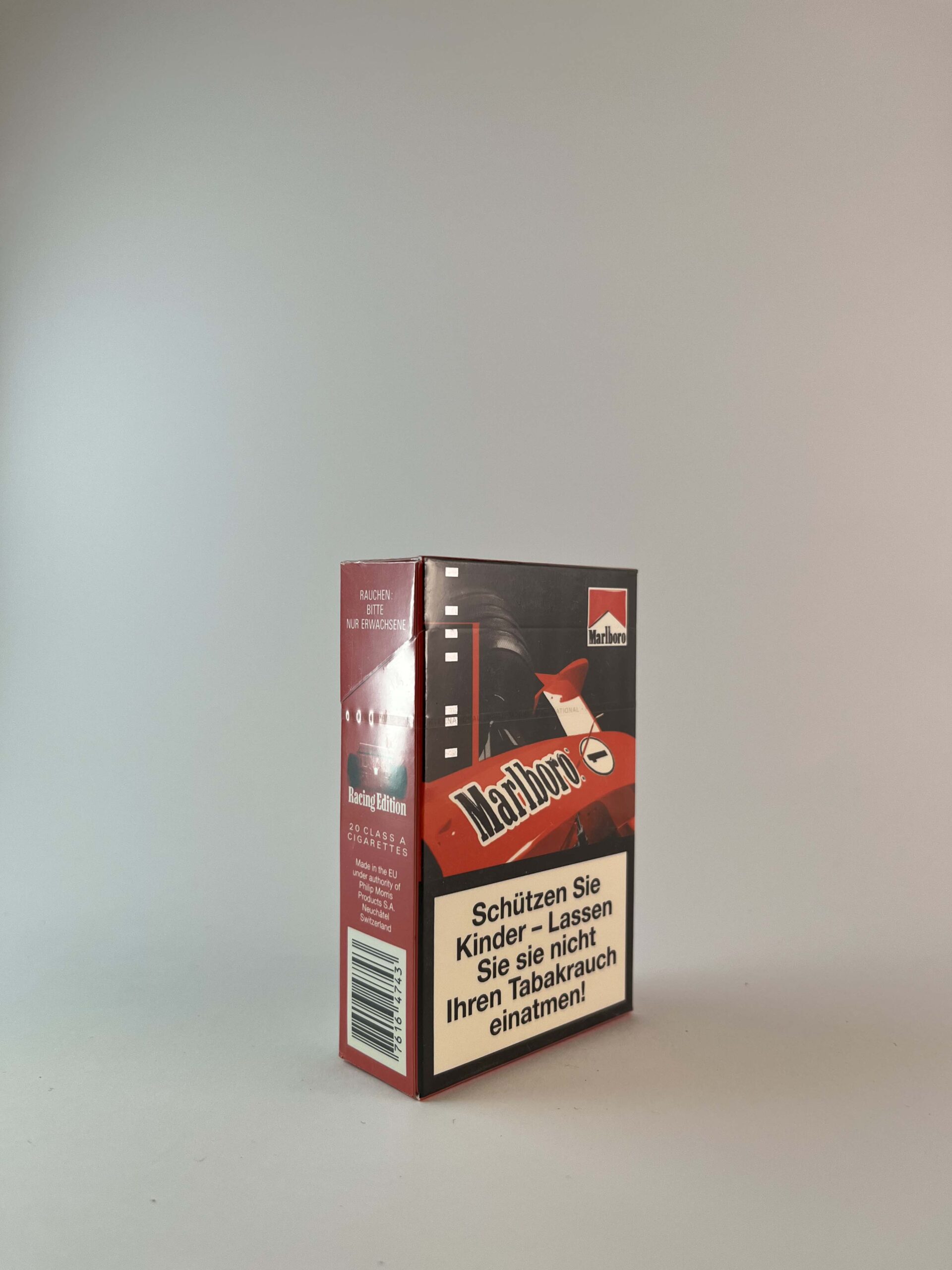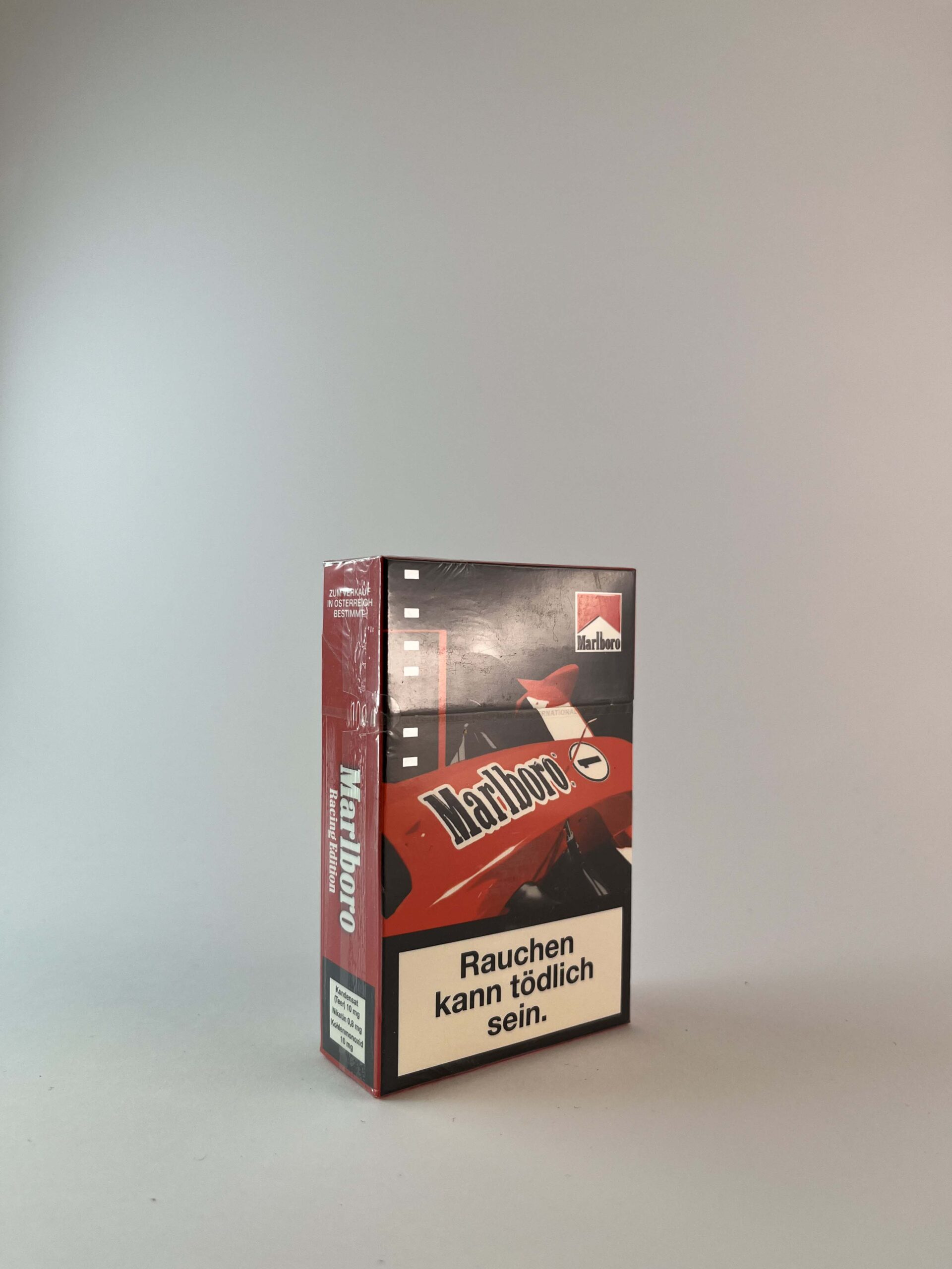 Description: Limited edition Marlboro Racing Edition cigarette pack, designed for Formula 1 fans. The pack is decorated with racing car motifs, red in color, and supplemented with textual warning information in German. Limited edition packs are often sought after by collectors due to their uniqueness and connection to racing.