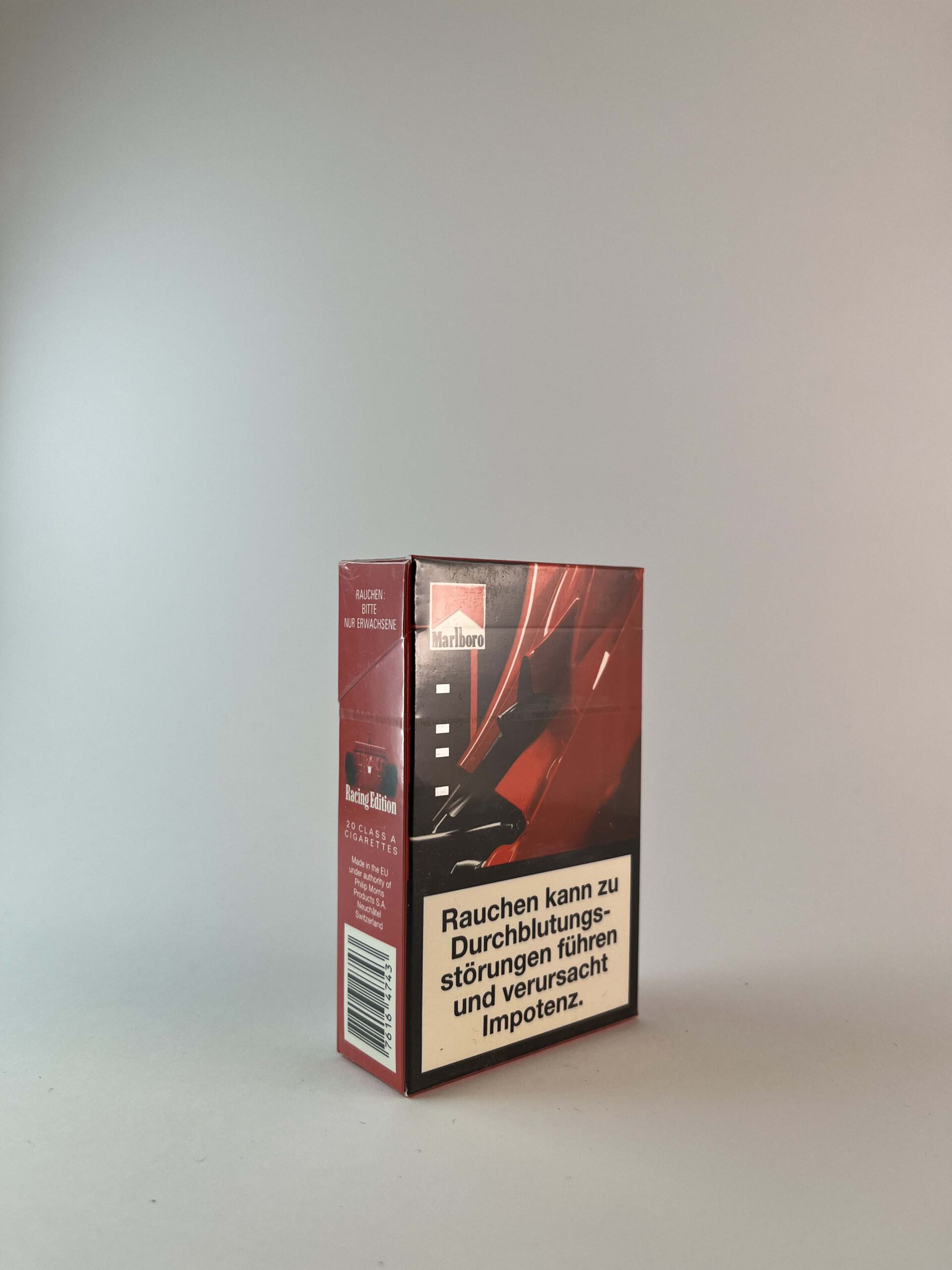 Marlboro Racing Edition is an exclusive limited edition pack with a design inspired by motorsport. The combination of bright red and black colors with racetrack motifs highlights Marlboro's involvement in Formula 1 sponsorship. The pack clearly displays a German-language health warning specific to the EU market.