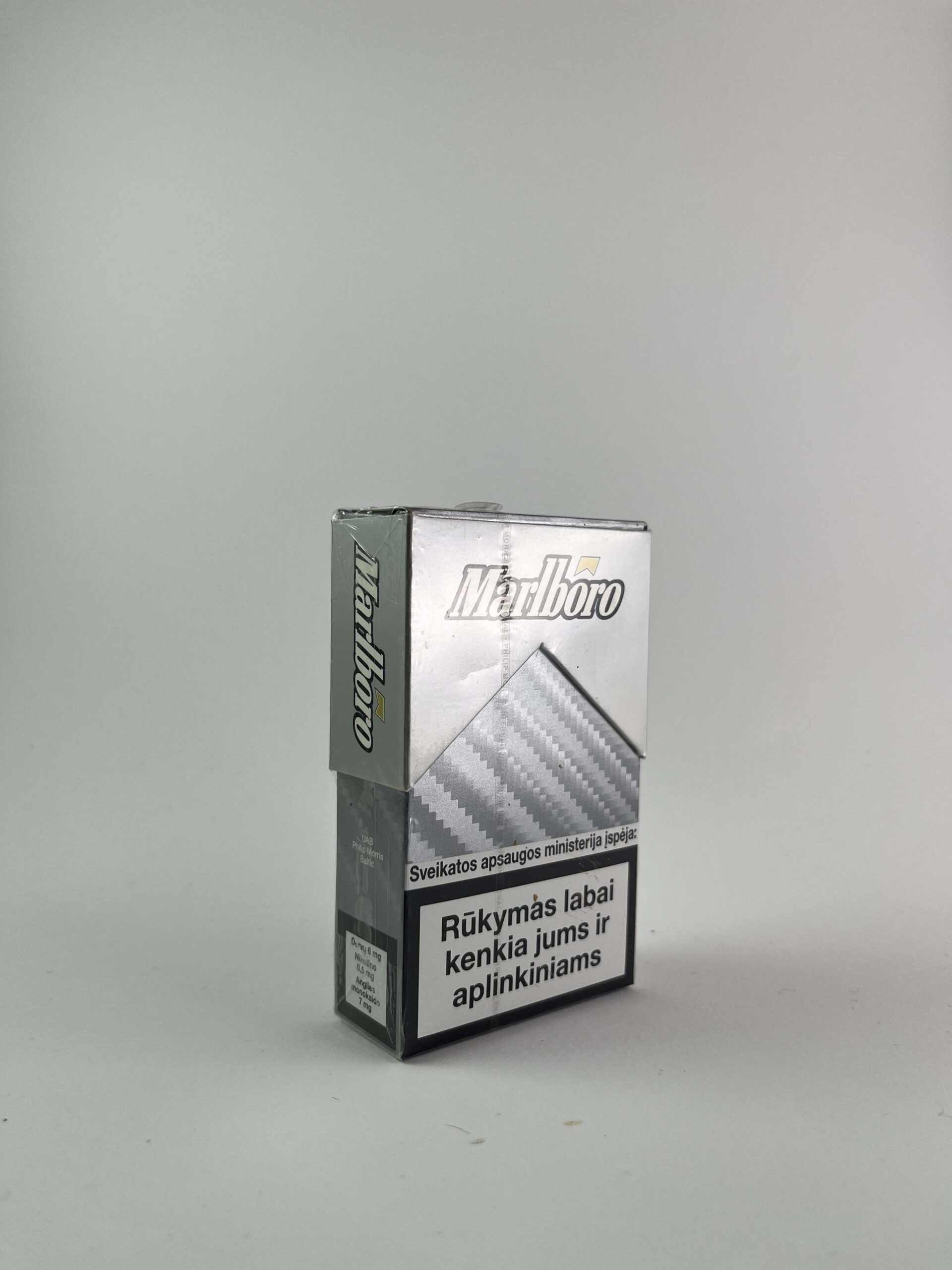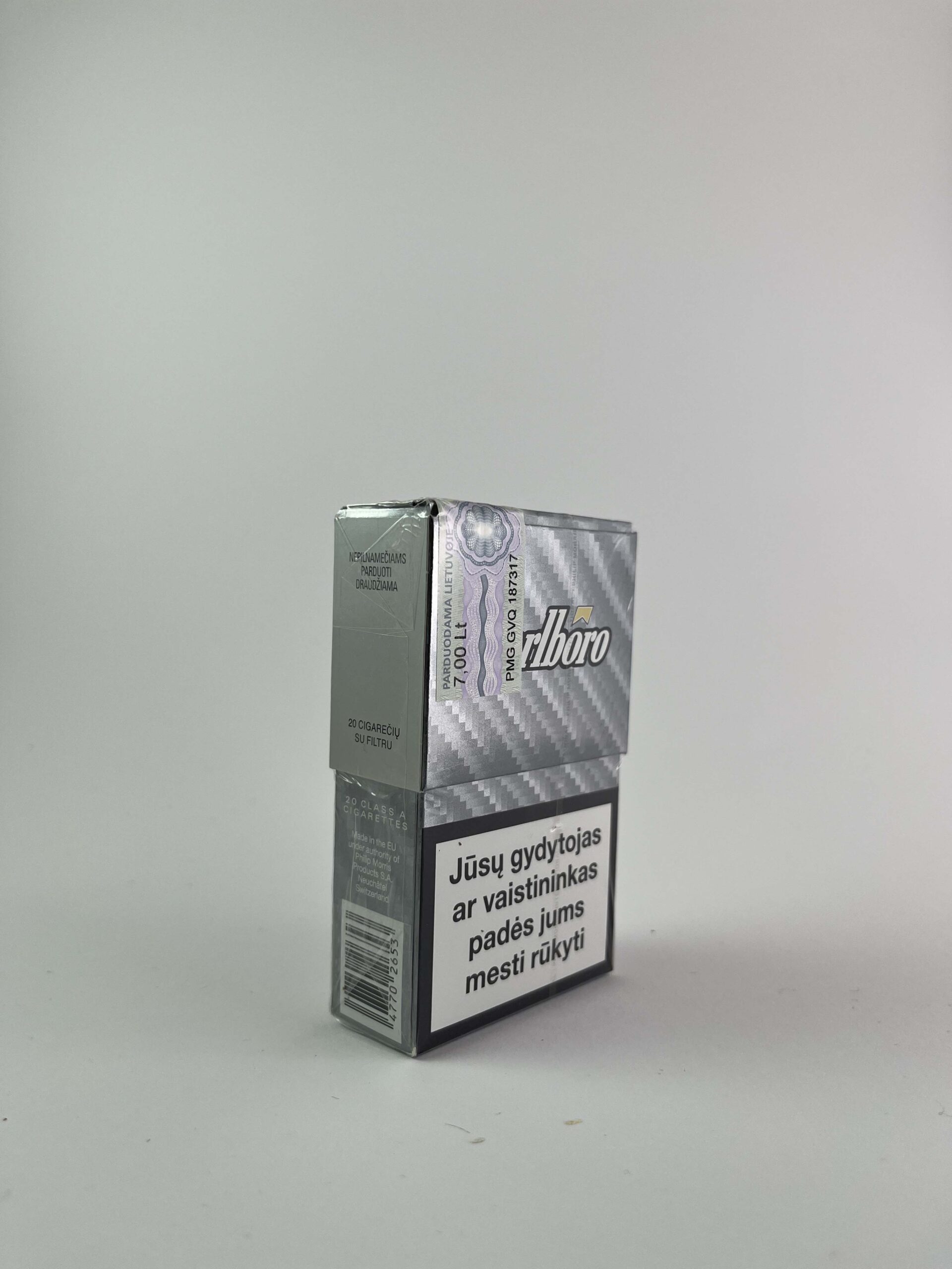 Short description: Pakelis su sidabrine ir juoda spalvomis, būdingu „Marlboro“ minimalistiniu stiliumi. Įspėjimas apie rūkymo žalą matomas aiškiai ir užima didelę pakuotės dalį, kaip reikalaujama pagal ES taisykles.