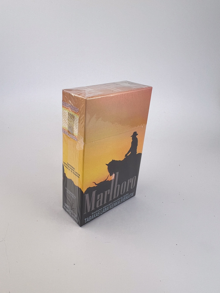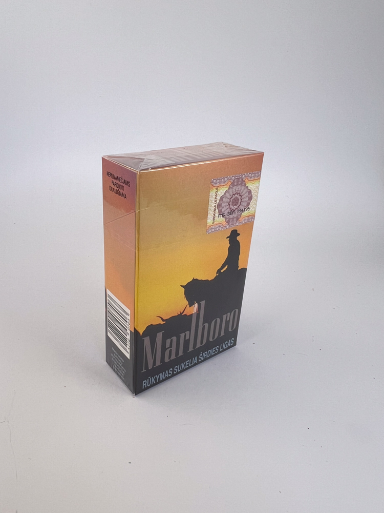 Teminis leidimas su klasikinio kaubojaus siluetu oranžinio saulėlydžio fone. Gradientinis geltonai–oranžinis dangus pereina į tamsų apatinį planą, kuriame „Marlboro“ logotipas pateiktas stambiu, sidabriniu šriftu – kontrastas sukuria aiškų, įtaigų vaizdą. Kompozicija minimalistinė, bet labai atmosferinė: siluetai ryškūs, linijos švarios, o paviršius turi lengvą metalizuotą blizgesį, būdingą ankstyvųjų 2000-ųjų ribotoms „Marlboro“ serijoms.
