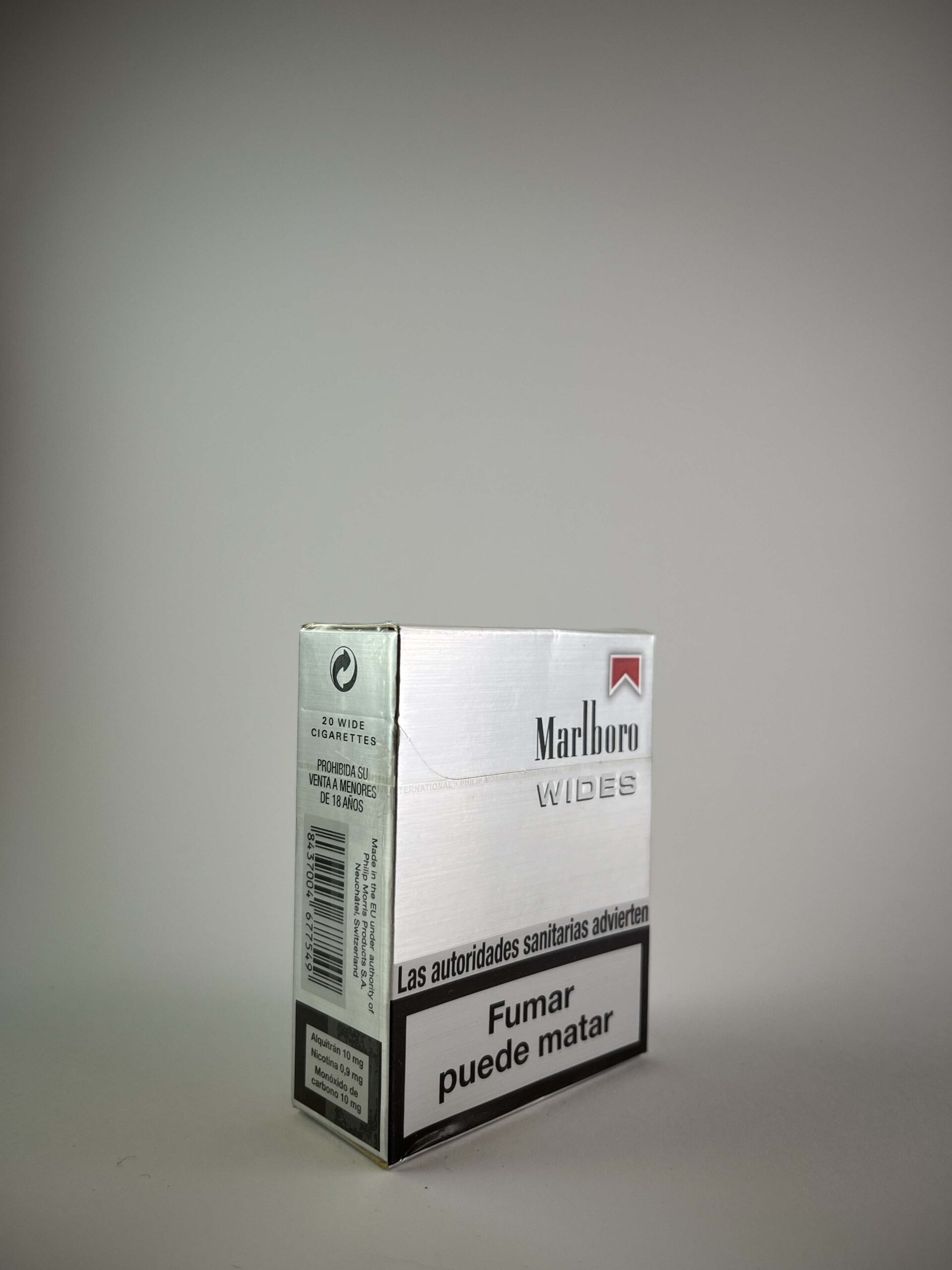 Marlboro Wides is a wide cigarette format that stands out for its unique packaging design. The pack is made of high-quality silver paper, with red accents and the brand logo. This packaging is intended for the Spanish market, as evidenced by the warnings in Spanish on it, such as "Fumar puede matar" (smoking can kill) and the official Spanish tobacco tax symbol.