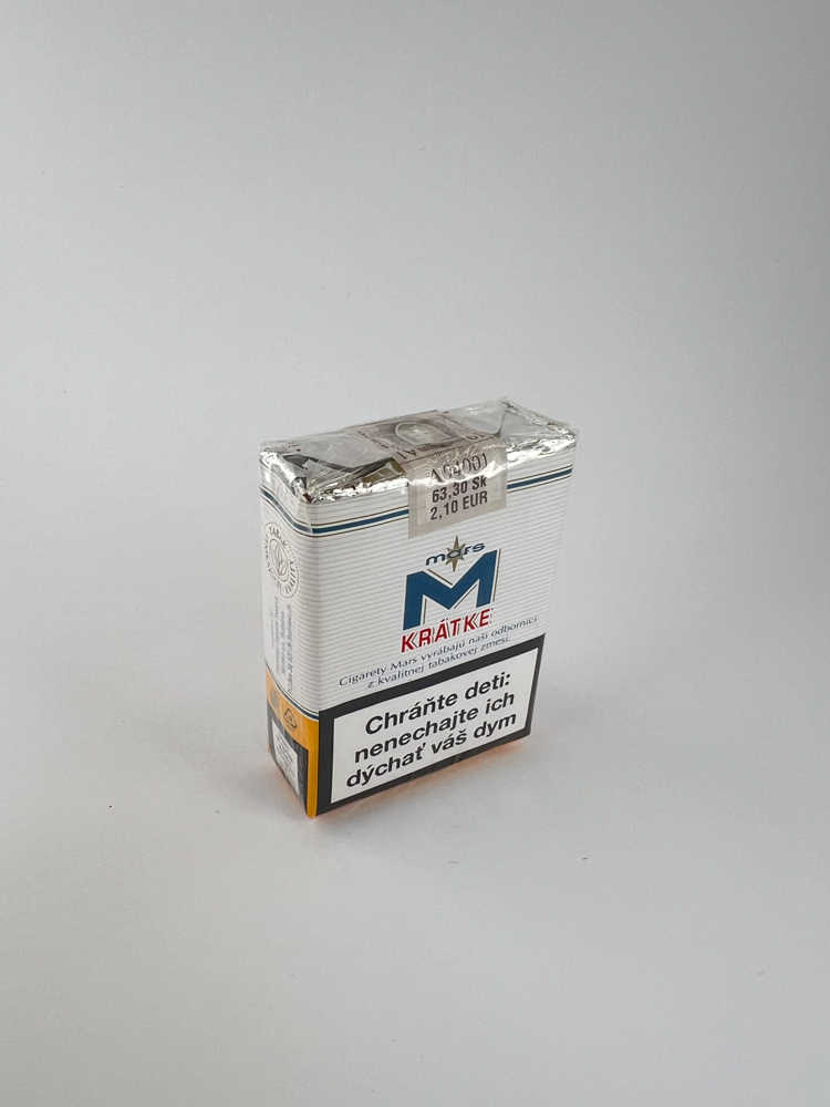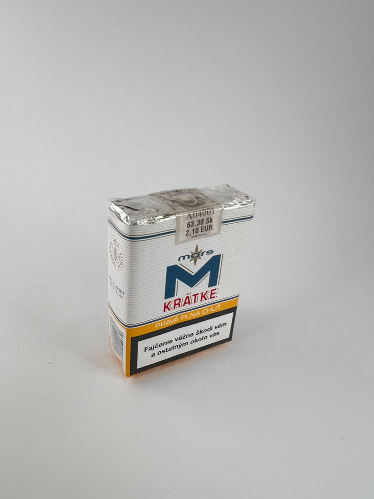 Description: This Mars Krátke pack features a minimalist, clean design – white background with blue „M“ logo, bold black and red border line. A version with metallic foil on top may be available. Health warning in Czech at the top („Chráňte děti…“) and at the bottom („Fajčenie vášné škodí…“), clearly indicating the requirements of Slovak law.
