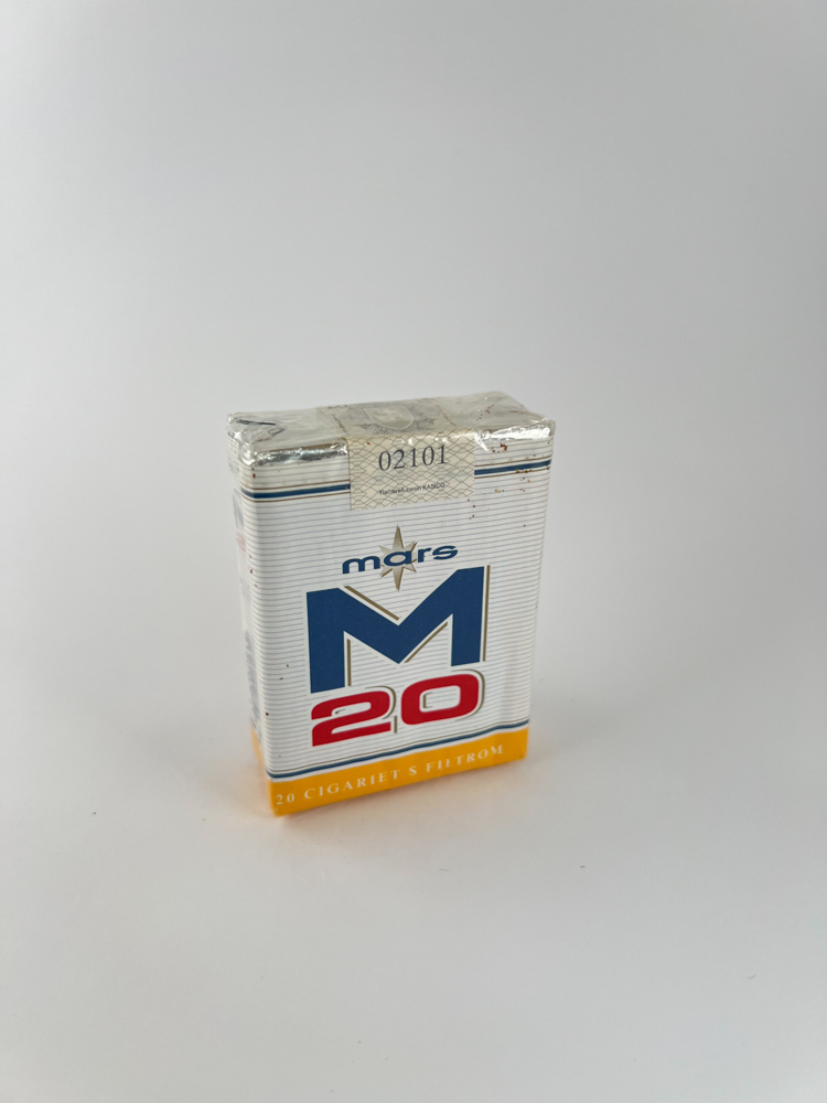 Description: The packet features an elegantly striped white background, a large dark blue „M“ in the centre, and red numbers „20“ at the bottom. In the mouth are warnings in Slovak („Fajčenie vášné ohrozuje vaše zdravie…“) with a yellow background. At the top is a foil and a stamp with the serial number („02101“). The style is modest, typical of the Northern European appearance from the end of the 20th century.