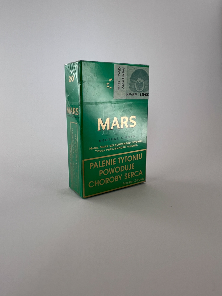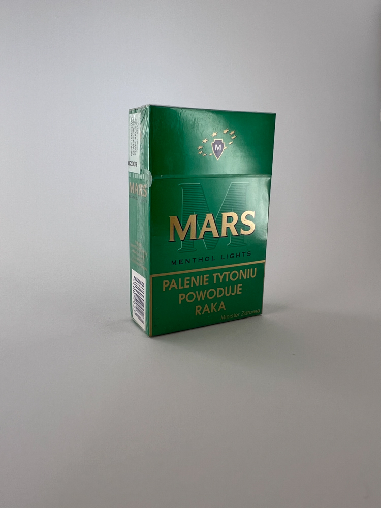 Šis „Mars Menthol Lights“ cigarečių pakelis yra ryškiai žalios spalvos, išsiskiria minimalistiniu dizainu su aukso spalvos logotipu ir užrašais. Ženklinimas rodo, kad tai lengvo mentolio skonio cigaretės. Pakuotėje matomi įspėjimai apie rūkymo žalą yra pateikti lenkų kalba ir yra senesnio dizaino, kas leidžia daryti išvadą apie pakelio amžių.