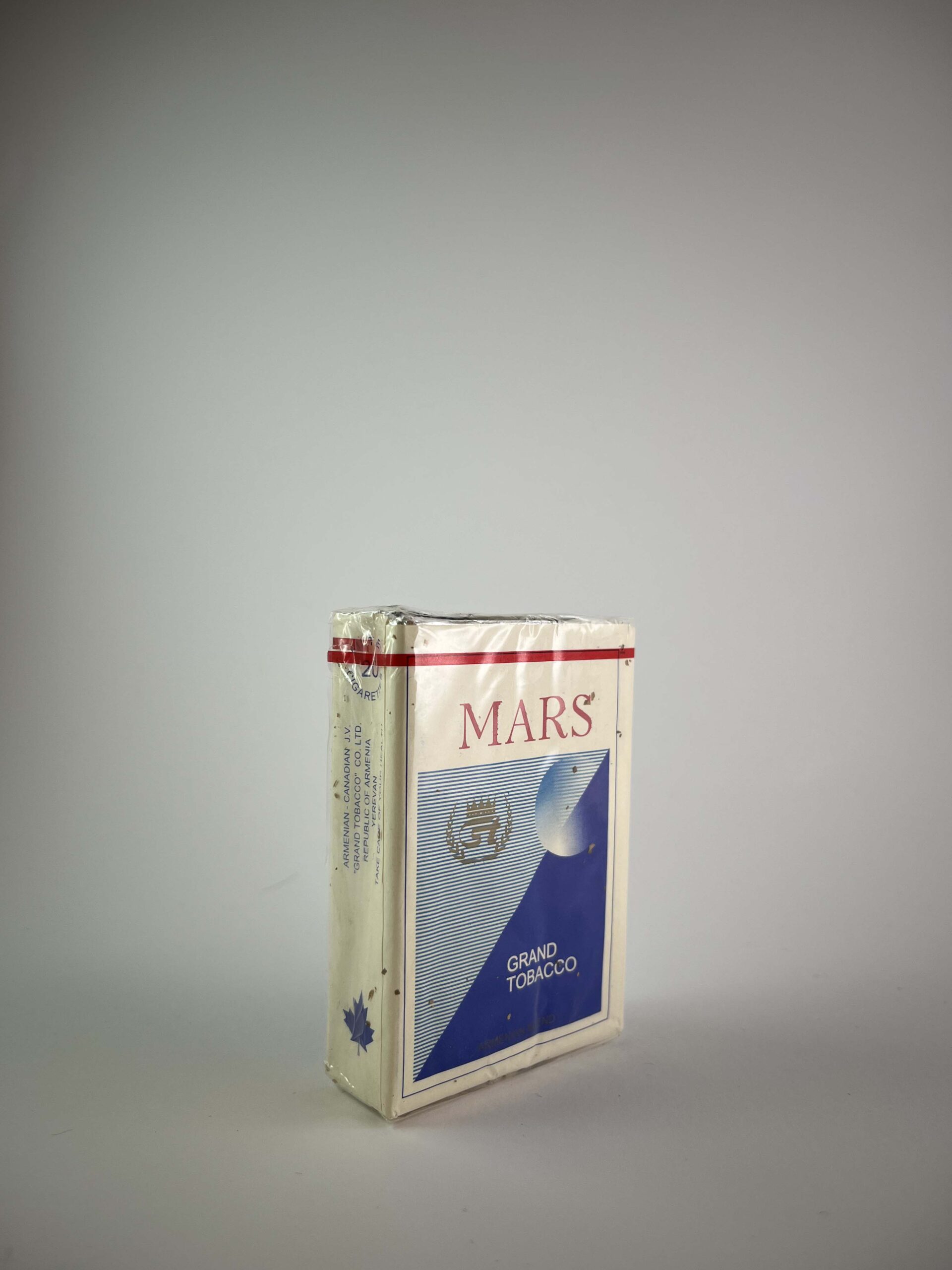 This pack of Mars Grand Tobacco cigarettes has an elegant and minimalist design, dominated by white with blue graphic accents and a red line at the top. The logo features an interpretation of the planet Mars, along with the Armenian production mark, which adds regional authenticity. The design looks classic and is aimed at traditional smokers. This is an easily recognizable product of the Armenian tobacco market, which may be of interest to collectors due to its provenance.