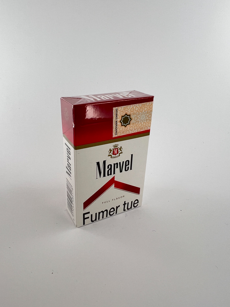 Description: The Marvel Full Flavor cigarette pack is clearly inspired by the classic Marlboro design – a white background, a red top and a characteristic „V“ shaped graphic element. On the front side there is a French warning „Fumer tue“ and on top there is a Moroccan excise stamp „Douanes Marocaines“. On the back side the identical design is repeated, indicating the „American Blend“ type of tobacco. The pack is intended for the Moroccan market, as indicated by the Arabic texts on the side edges. Visually it is a modern yet local pack, the production of which is focused on tobacco consumers in developing countries.
