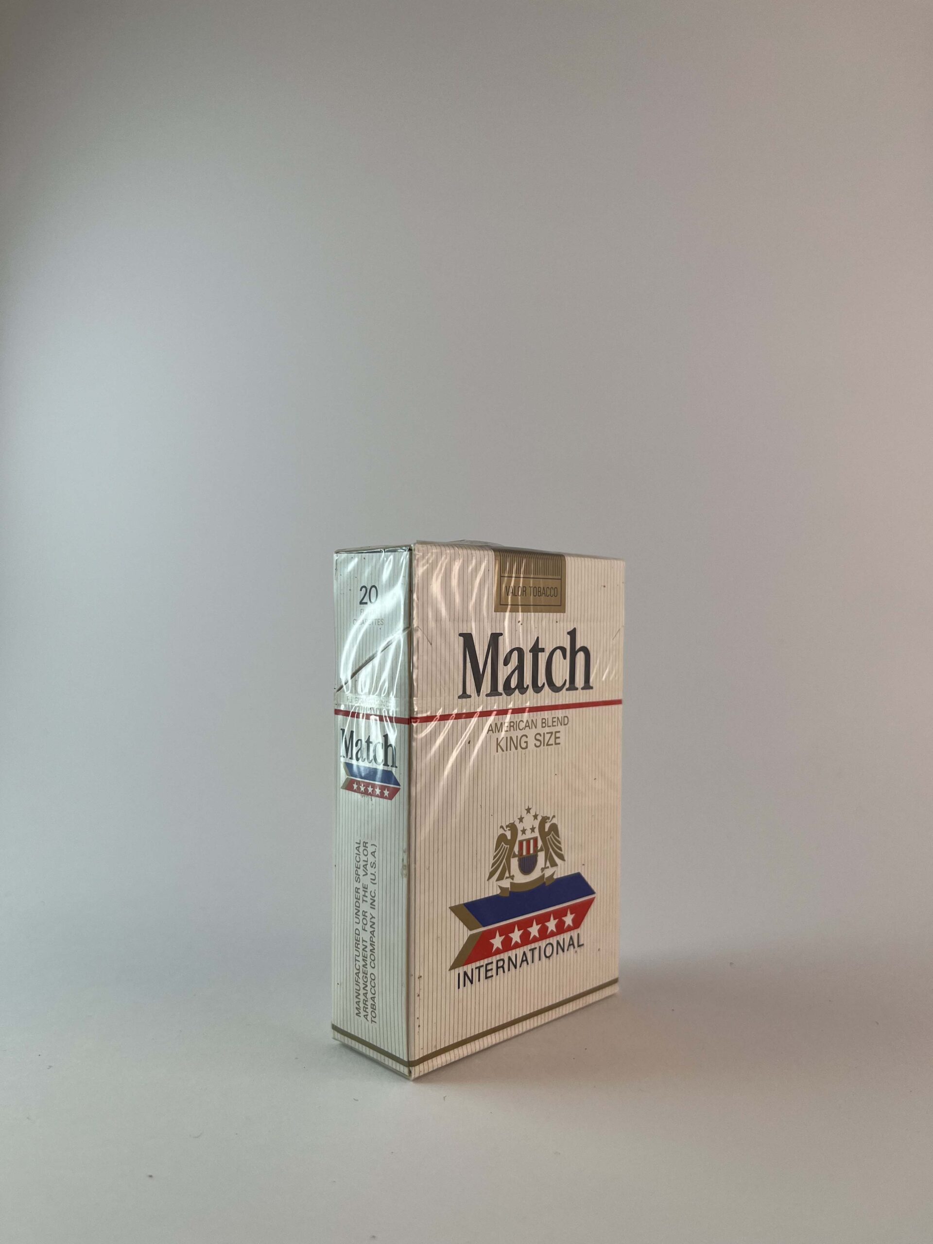 Description: This Match International cigarette pack features a minimalist white and blue design with red and gold accents. The brand logo is prominently displayed at the top of the pack, symbolizing international quality. The logo and star motif highlight the American tobacco blend. Reminders about the risks of smoking are provided as required.
