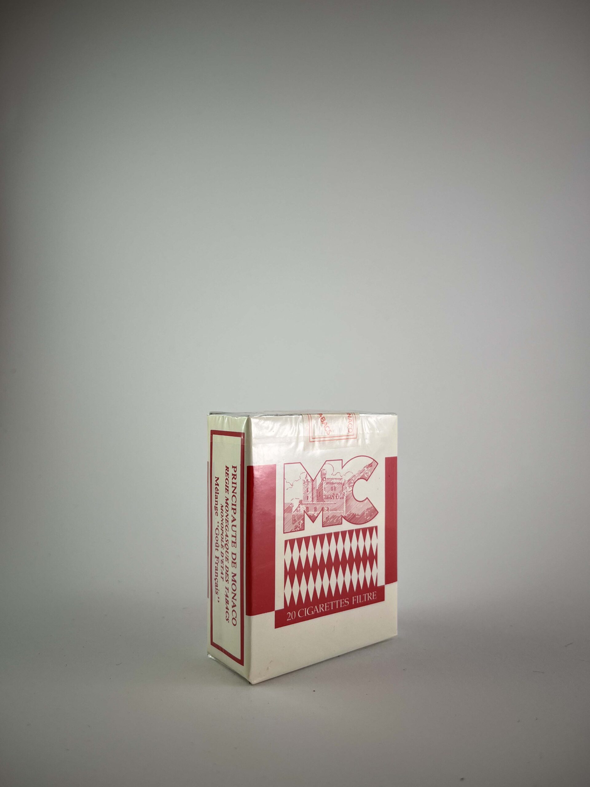 Description: The MC cigarette pack is distinguished by its simple but luxurious design, which reflects the image of Monaco. The white and red color combination, together with the Monaco coat of arms and the diamond pattern, are clearly associated with the symbolism of the Principality of Monaco. The inscription "20 Cigarettes Filtre" and references to the location emphasize the high quality and exclusive status of the product. This is a collector's rarity, intended for a specific market, and perhaps even produced in a limited edition.