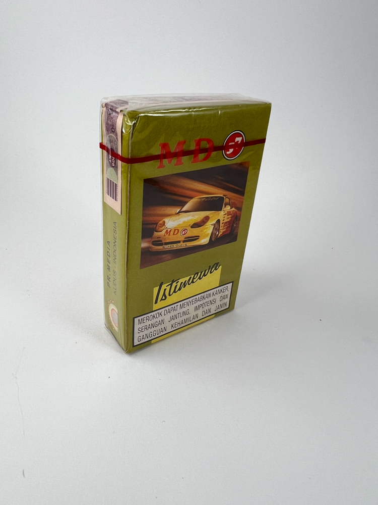 Žalia–geltona pakuotė su ryškiai raudonu „MD“ logotipu viršuje (kreisėje – raudonas ženkliukas). Centre – stilizuota saulė su spinduliais, apjuosta žvaigždėmis ir tekstu „Istimewa“. Apatinėje dalyje – sveikatos įspėjimas indoneziečių kalba. Ant šono – tekstas „PR. MEDIA KUDUS – INDONESIA“. Plomba pažymėta numeriu, siejama su vietine tabako kontrole. Dizainas minimalistinis, bet su išskirtiniu vaizdu (automobilio proką sušvelnintu fonu atvaizduoti kitame vaizde).