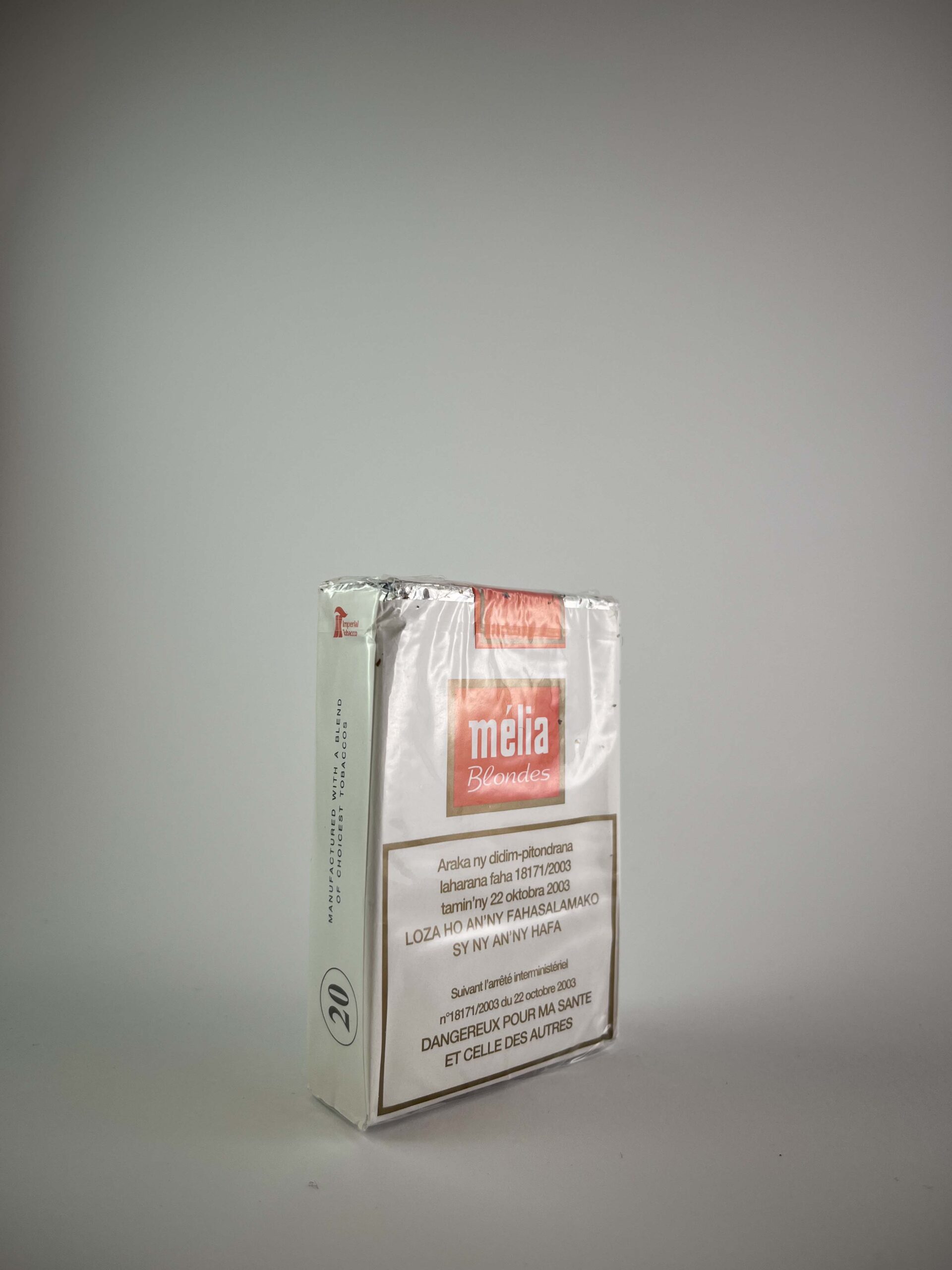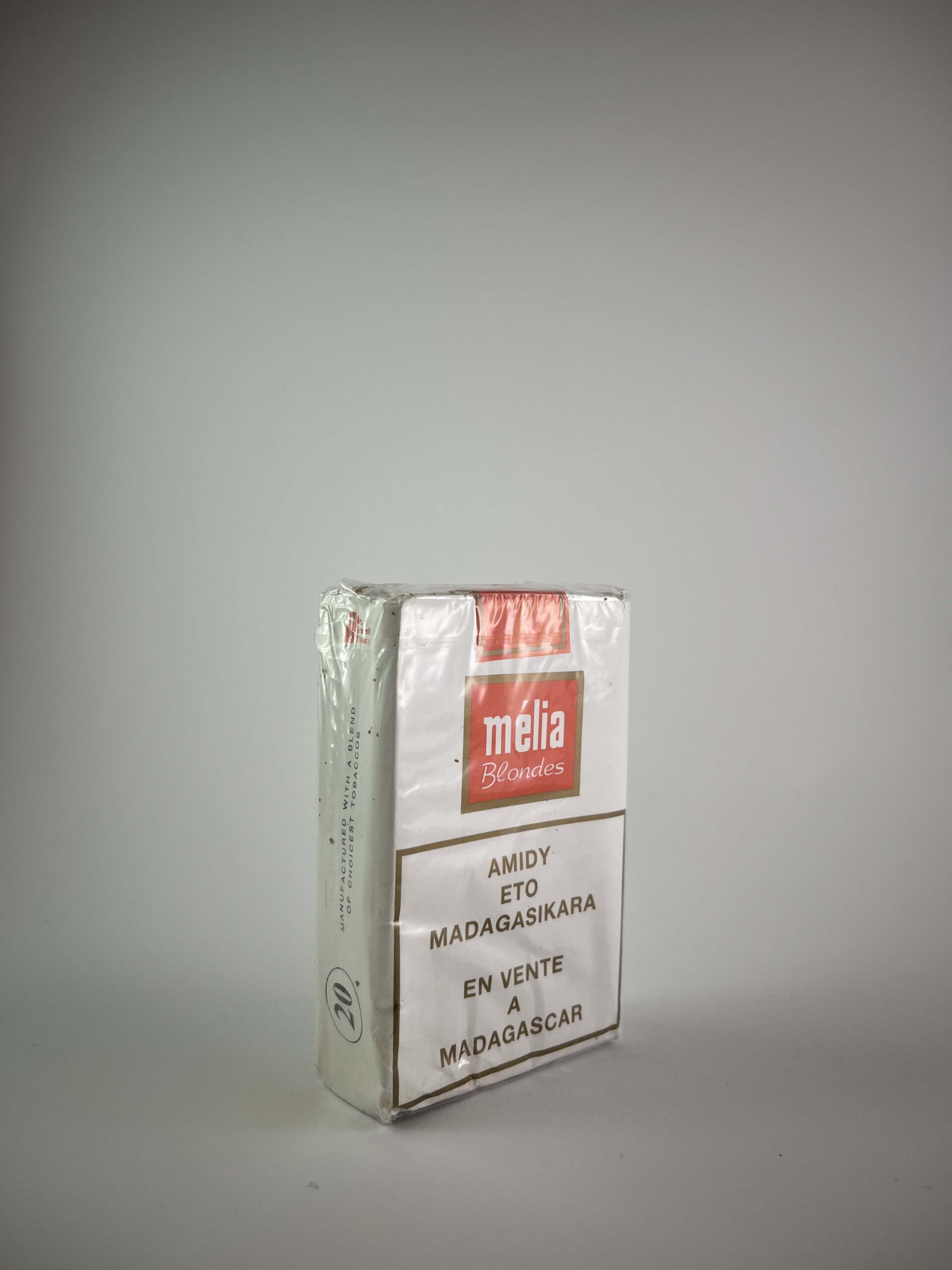 Description: The Mélia „Blondes” cigarette pack is intended for the local market in Madagascar, as indicated by the inscription „Amidy eto Madagasikara“ on the pack. The design is minimalist, with a white background and a red logo, maintaining simplicity and clarity. The health warnings are presented in several languages, reflecting the linguistic diversity of Madagascar.
