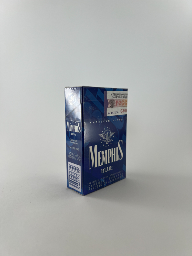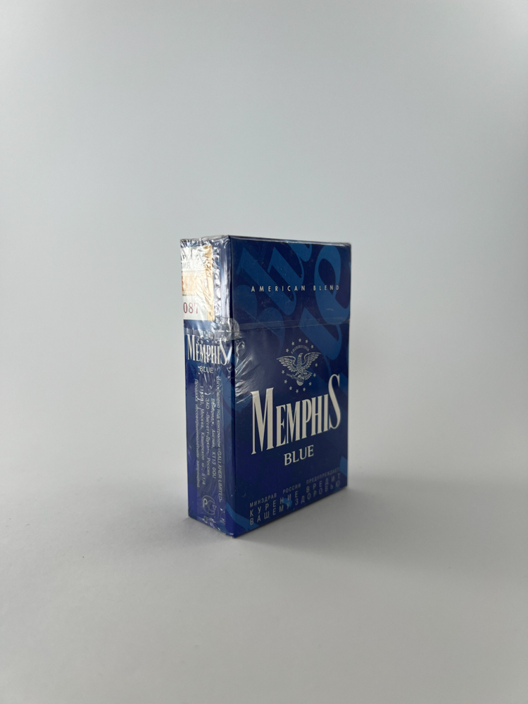 „Memphis Blue is an American-style (American Blend) cigarette pack for the Russian market. The pack is blue in color, with a white logo, eagle symbols and star motifs imitating the image of the United States. This edition was produced according to the then Russian GOST standards, which specified the burning tar and nicotine levels. The design reflects a period when local manufacturers sought to provide alternatives to Western brands. The inscriptions "American Blend" and the name "Memphis" were used as signs of an international style, but the product itself was produced locally.