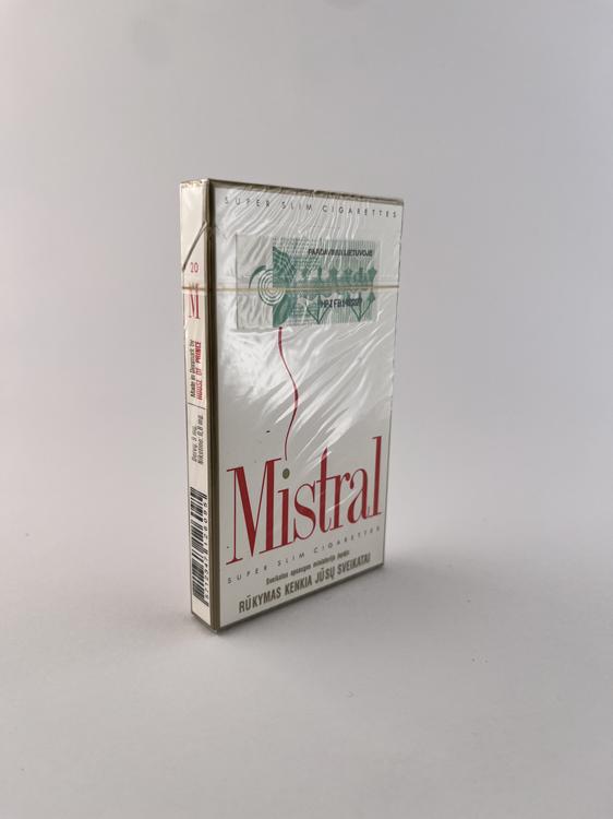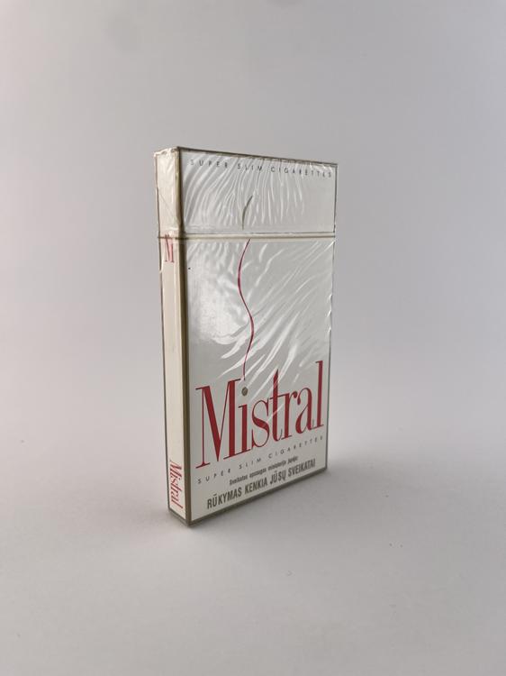 Šis „Mistral“ cigarečių pakelis pasižymi labai švariu ir minimalistiniu dizainu, kuriame dominuoja balta spalva bei plona, stilizuota raudona linija, imituojanti dūmų formą. Pavadinimas „Mistral“ pateiktas elegantišku serifiniu šriftu, kuris suteikia pakeliui subtilios klasikos pojūtį. Dizainas aiškiai atspindi pereinamąjį laikotarpį tarp senesnių ir modernesnių pakelių, kai dar nebuvo dominuojančių didelių grafinių įspėjimų. Lietuviški įspėjimai ir senesnio tipo akcizo ženklas rodo vietinę rinką bei ankstesnį laikotarpį.