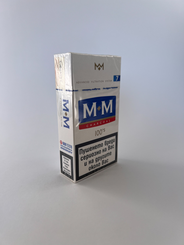 „M•M Charcoal 100's is one of the versions of the product manufactured by Bulgartabac, which has an advanced carbon filtration system (Advanced Filtration System) for a smoother smoke taste. The design of the pack is modern and clearly oriented towards the mass consumer - white and silver colors dominate, while red and blue accents add exclusivity. On the front and back are inscriptions in Bulgarian about the harm of smoking and helpline numbers. On the top part - a Bulgarian excise stamp.