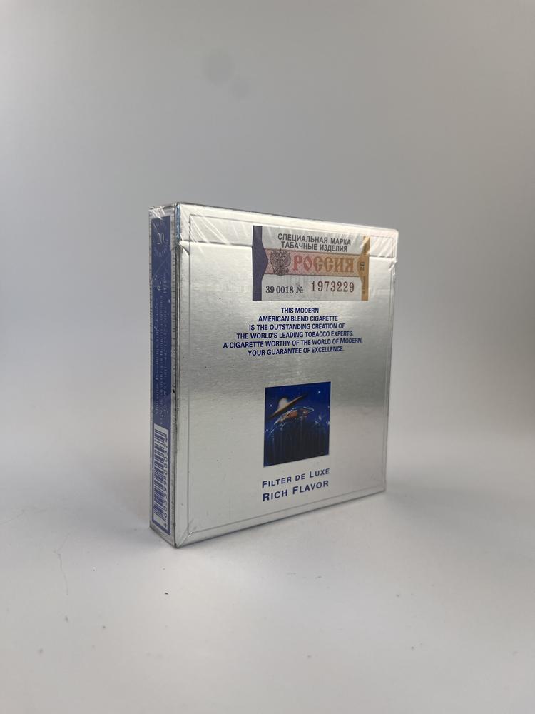 The top part features the brand name in a minimalist font with a subtle red star accent. The bottom part features the inscription Rich Flavor, indicating a rich flavor profile. A description in English is added to the back, highlighting the manufacturer's goal of creating a "cigarette worthy of the world of Modern". At the top of the pack, a Russian excise stamp with a serial number is visible, allowing the specimen to be dated as a domestic market product.
