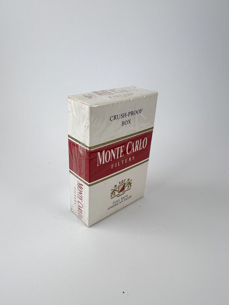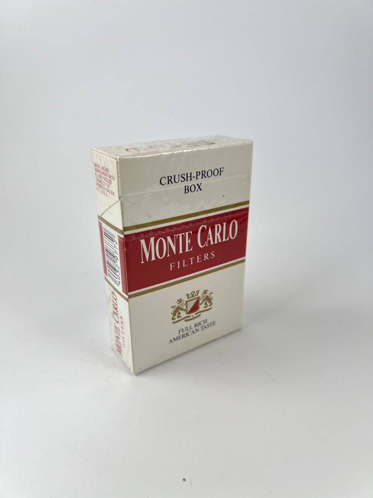 Monte Carlo Filters is a cigarette pack with a classic design, dominated by a combination of red and white colors, with gold details and coat of arms symbols at the bottom. The pack is marked with the inscription "Full Rich American Taste" and "Crush-proof box", which is typical of older American-type releases intended for export to Eastern European and Asian markets. Therefore, it can be assumed that this is a product from the 1990-2000 period. There are no excise or warning stickers on this pack, which allows us to conclude that it is not intended for the EU market.