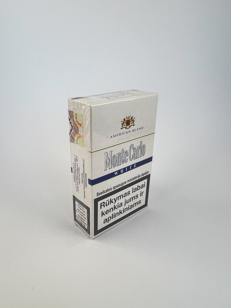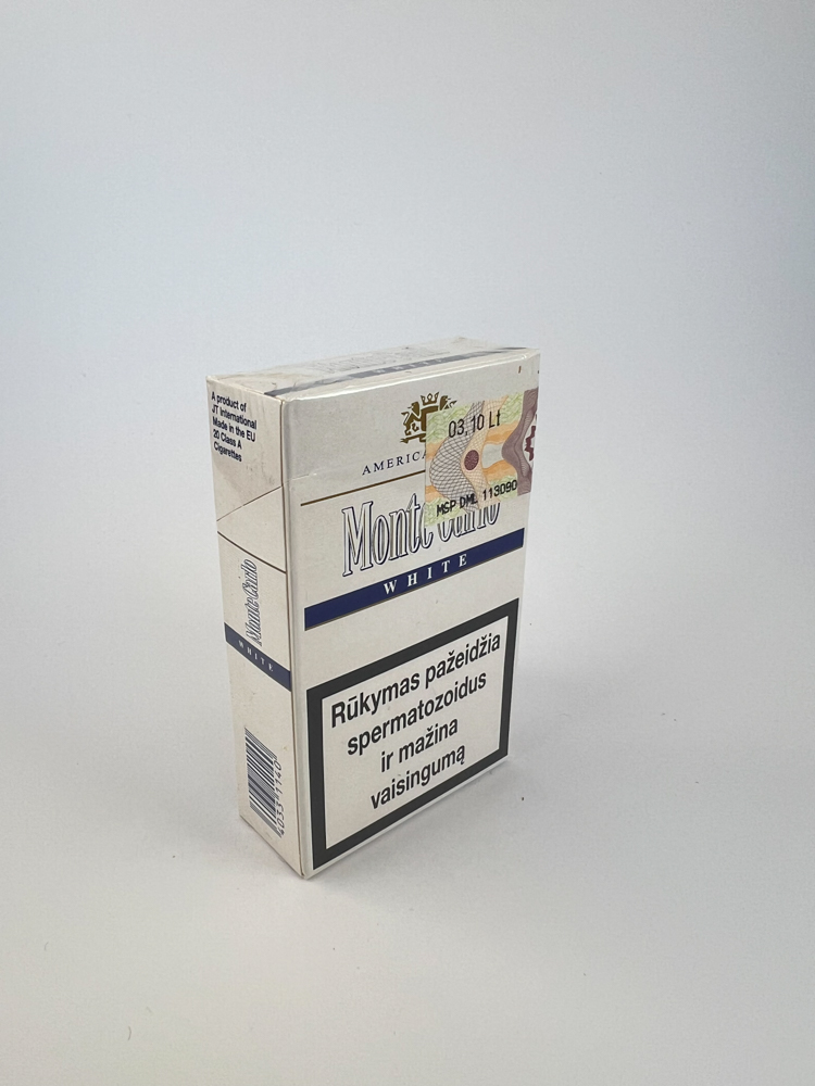 Description: Šis „Monte Carlo White“ pakelis pasižymi minimalistiniu, švariu dizainu – baltas fonas, klasikiniai logotipai, mėlyna horizontali juosta bei užrašas „American Blend“. Tai lengvo skonio cigaretės, skirtos rūkytojams, vertinantiems švelnesnius dūmus. Pakelis turi lietuvišką banderolę su 3,10 Lt nominalu, leidžiančiu tiksliai datuoti leidimo laikotarpį. Įspėjimai apie rūkymo žalą pateikti pagal tuomet galiojusią Lietuvos reglamentaciją.