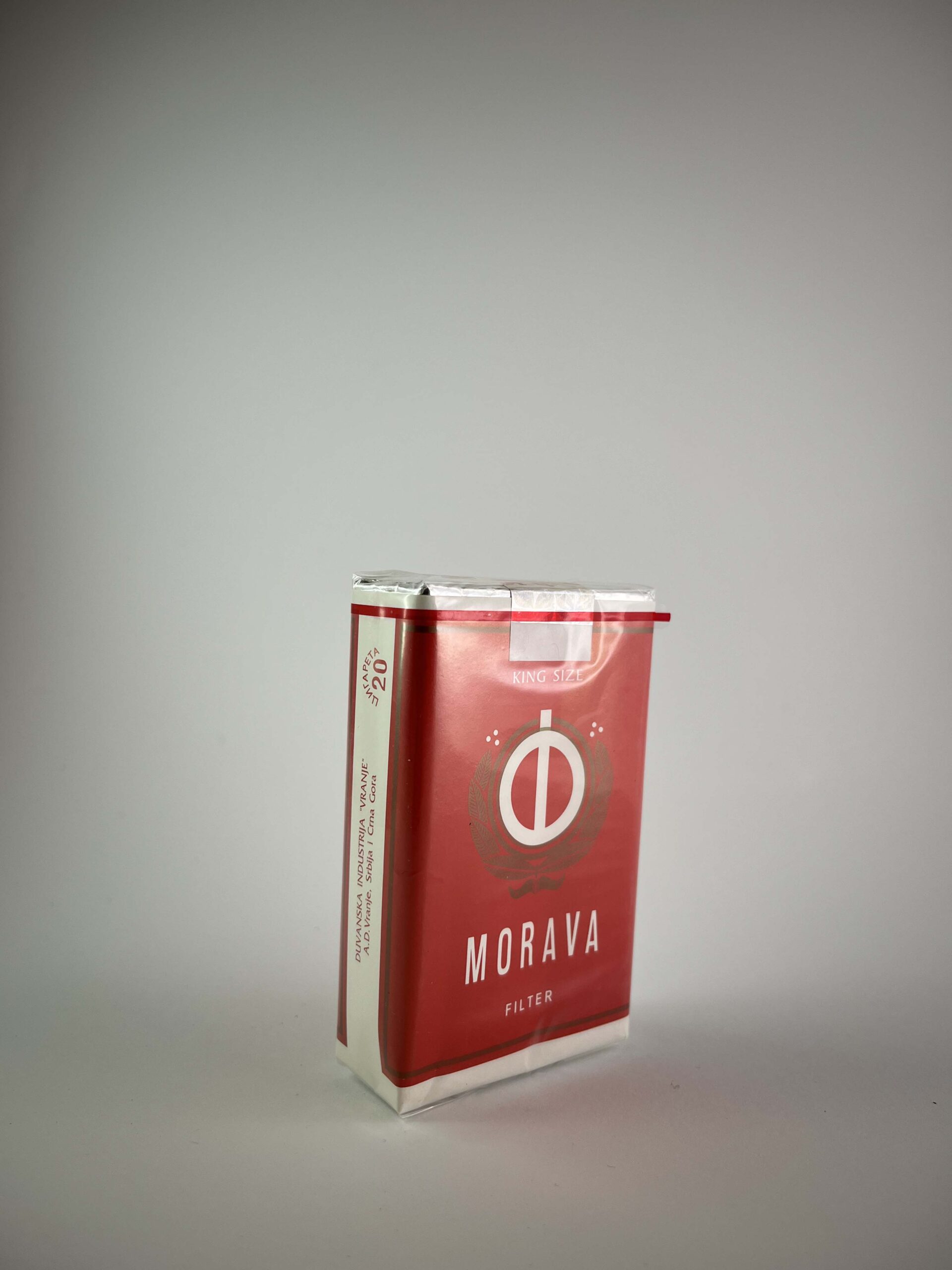 Description: Morava Filter is a cigarette pack with a simple yet expressive design, distinguished by a combination of red and white colors. The pack features the company logo, a stylized interpretation of the Morava name, and other visual elements that are reminiscent of a minimalist retro style. The packaging is marked with the text „King Size”, indicating that the cigarettes are of standard length. The warning about the harms of smoking is presented in two languages, including Serbian, which makes it possible to understand the local market orientation of this product.