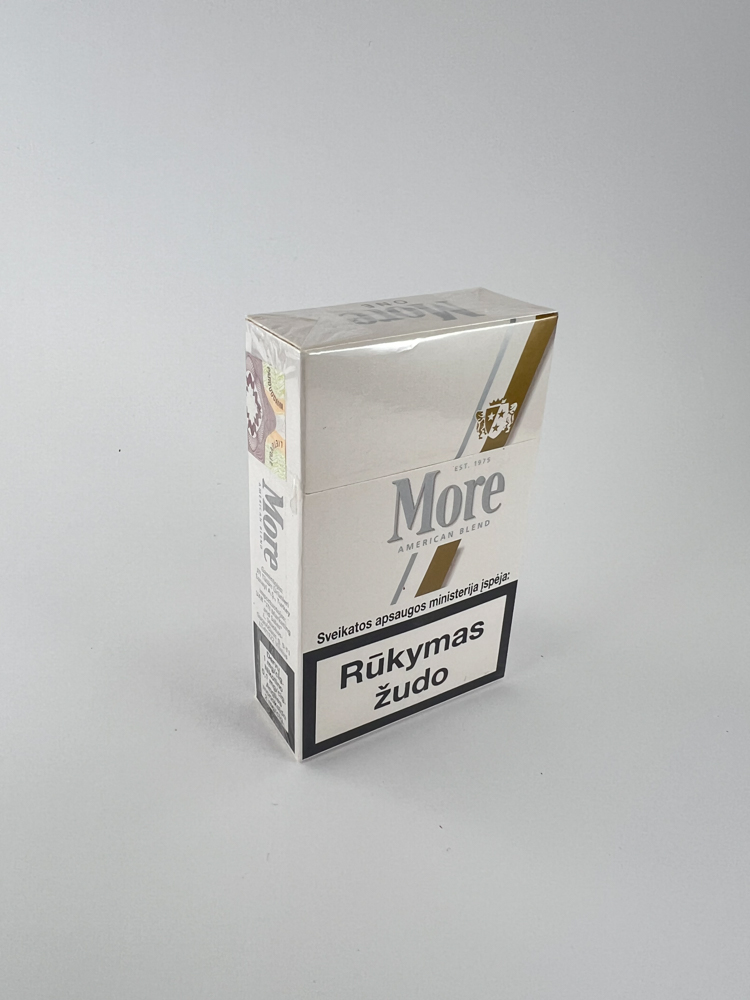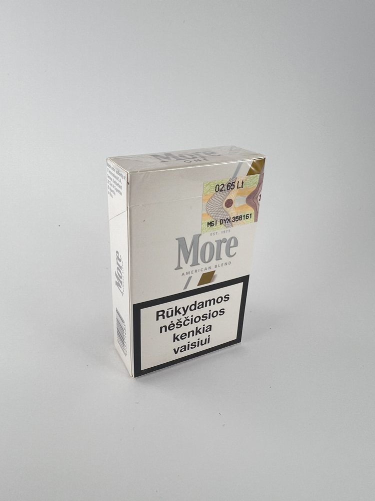 Description: More „One“ versija – tai lengvesnė šio prekės ženklo linija, su šviesiu (baltu) dizainu ir auksiniu akcentu. Pakelis skirtas Lietuvos rinkai – tai liudija įspėjimai lietuvių kalba ir akcizo ženklas su 2,65 Lt kaina. Vizualiai pakelis labai minimalistinis, elegantiškas, su šiuolaikiškomis formomis ir logotipu. Tai mažai paplitęs variantas, nes „One“ serija buvo mažiau populiari nei įprastos More versijos.