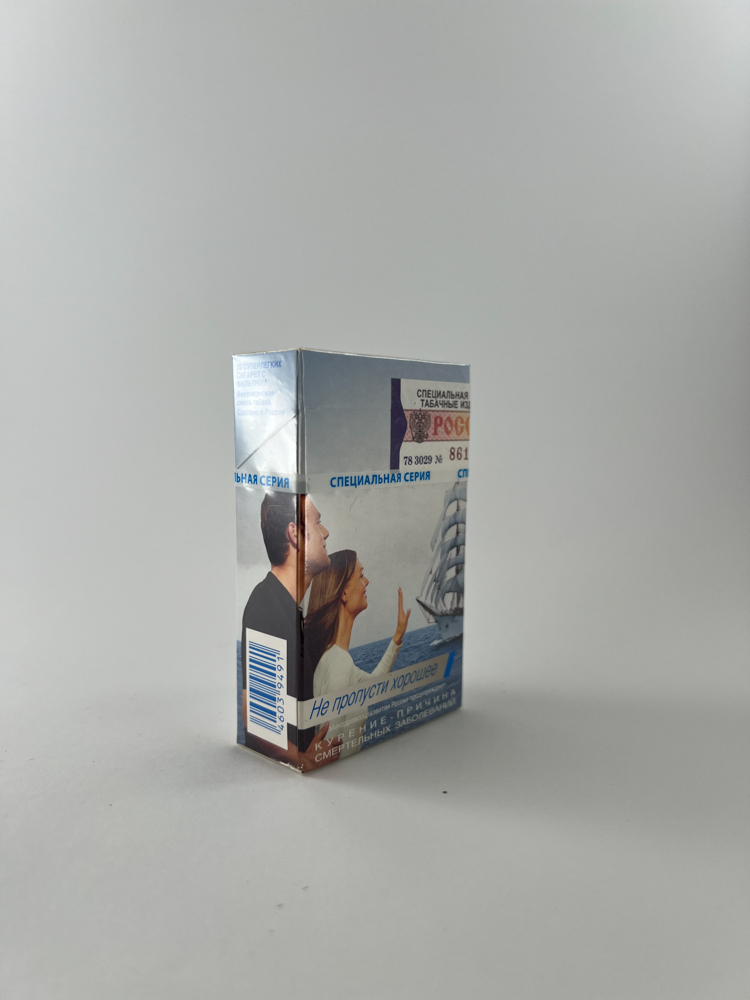 This pack of More Super Lights cigarettes belongs to the „special series“ (Russian: специальная серия), as evidenced by the inscriptions on the package and thematic design. The front of the pack retains a minimalist, light design with a blue accent, consistent with the „Super Lights“ line, while the back depicts a romantic scene - a couple looking at the sea and a sailboat, with the slogan „Не пропусти хорошее“ (lit. „Don’t miss out on what’s good“). This series was part of a wave of emotional advertising focused on conveying lifestyle and romance. The package is perfectly preserved, with a film and a banderol.