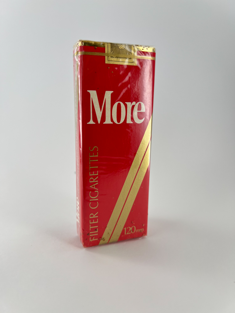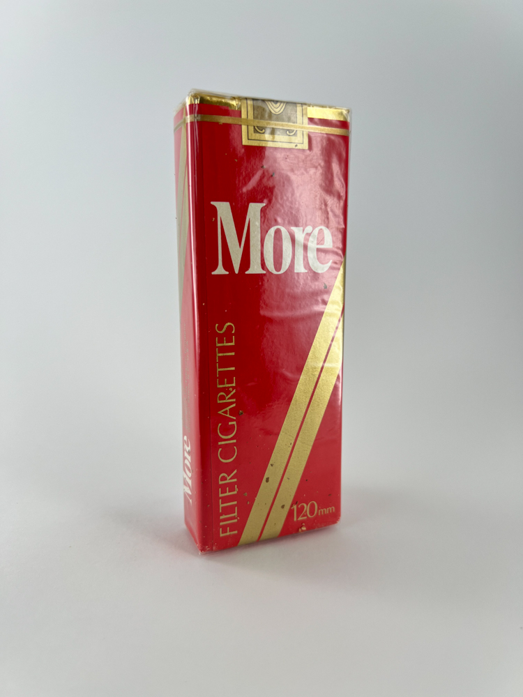 This More cigarette pack features a red color with elegant gold details and a stylized logo. More is a cigarette brand of American origin, created in 1975, which is aimed at a female audience and is distinguished by its 120 mm long cigarettes. The pack is long and narrow, which is typical of the „slim“ and „elegant type“ formats. The packaging does not have the standard health warnings - which suggests that this is an older edition pack, likely from the period before the EU directives on labeling came into force.