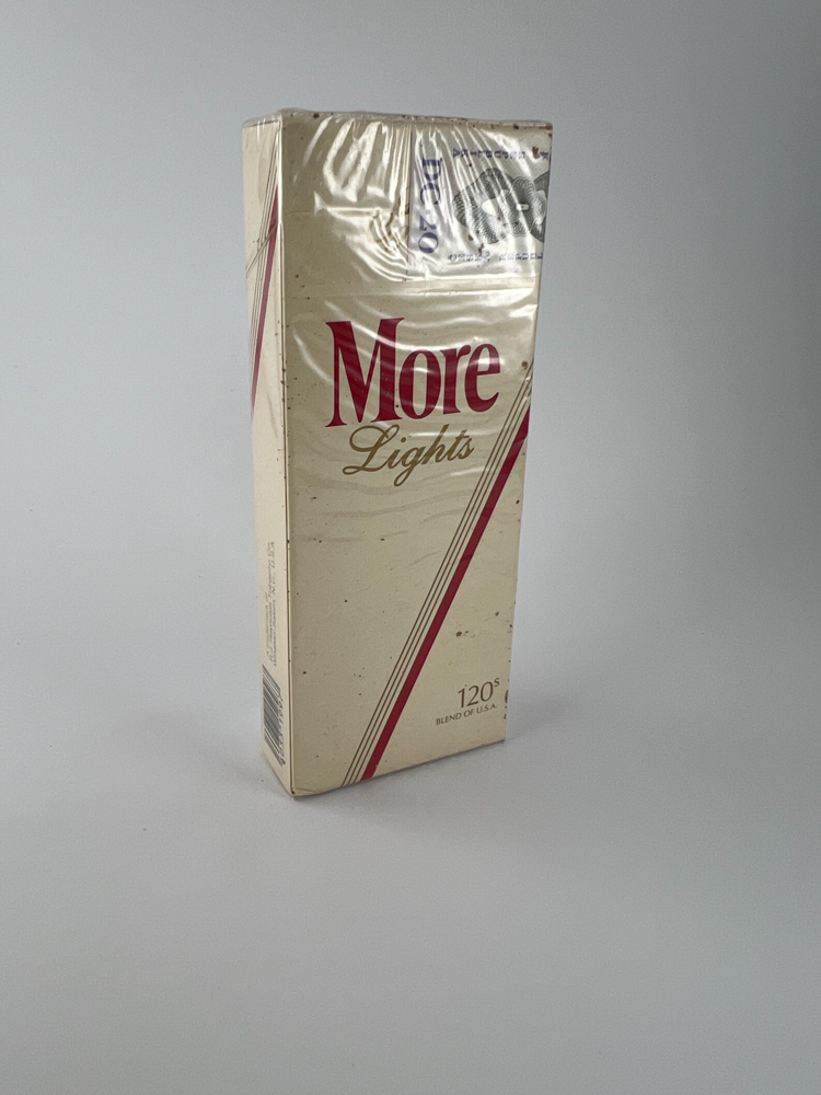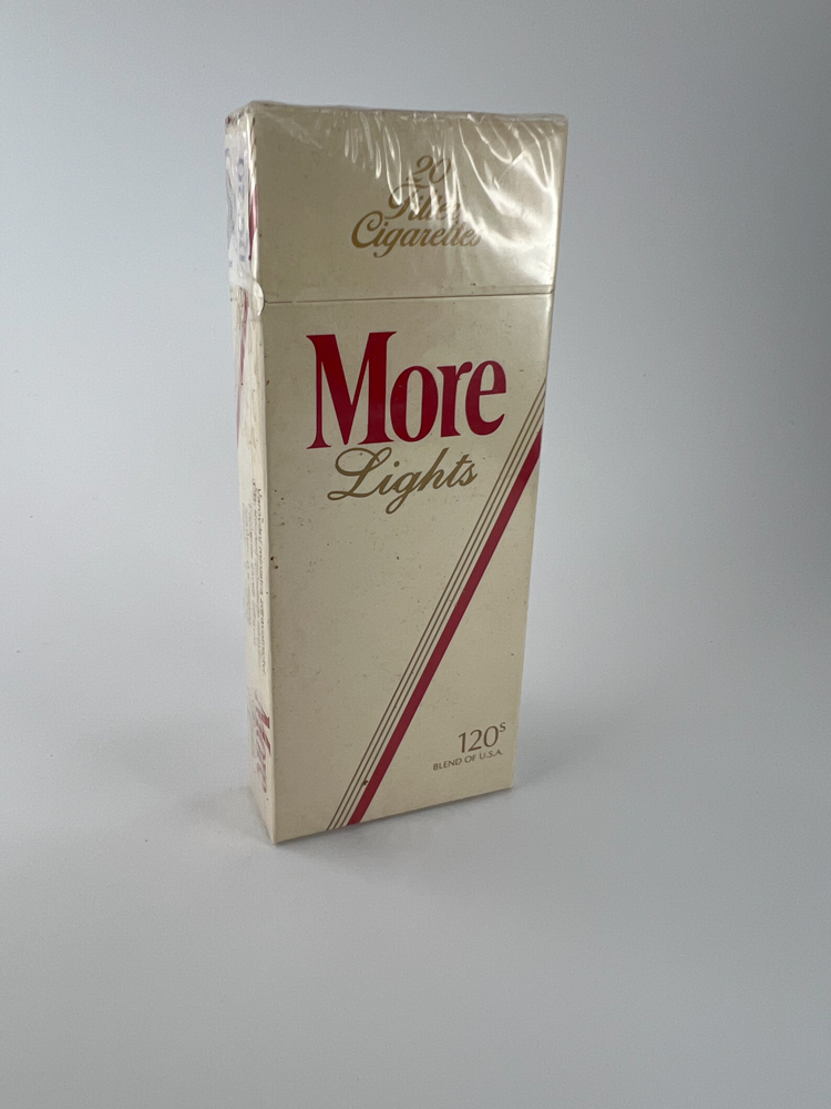 Description: This pack of More Lights 120's cigarettes is a long format (120 mm) version, featuring a minimalist cream-colored design with red font and diagonal line. It is a softer version of More, aimed at a female audience, which was popular in the US and international markets. The pack is marked "Blend of USA" and has a clear original tax sticker on top. The pack is unpacked, but there are signs of storage - surface stains.
