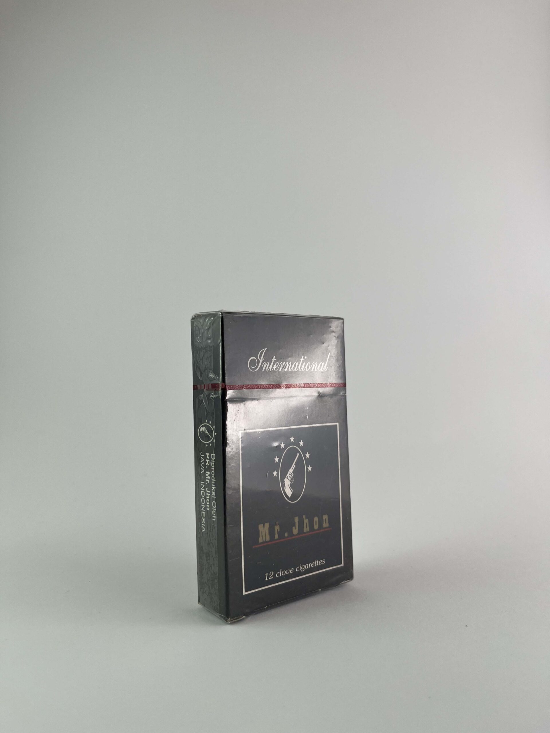 Description: This Mr. Jhon cigarette pack is designed for the international market and features a dark design aesthetic dominated by black and minimalist elements. The pack highlights the high quality of tobacco and cloves, providing an intense taste and aroma. The pack carries a health warning about the dangers of smoking, as is customary for the Indonesian market.
