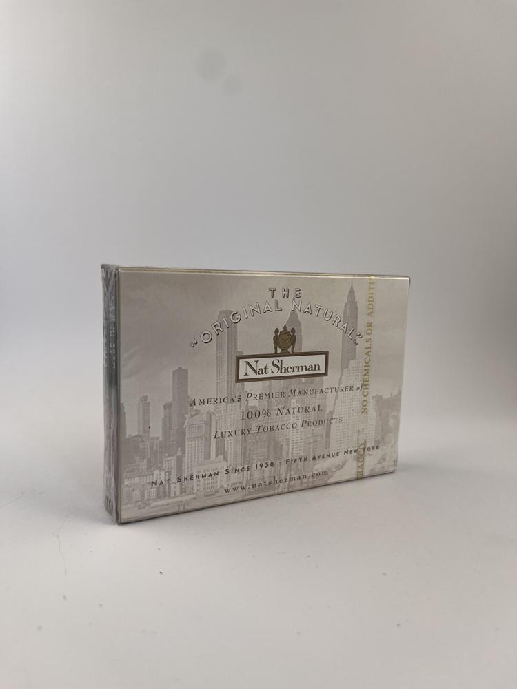 Vertically highlighted text on the left side 100% Natural Tobacco, indicating that the product does not contain chemical additives or artificial fragrances. The back features a New York City skyline backdrop and the classic Nat Sherman logo with the inscription America's Premier Manufacturer of 100% Natural Luxury Tobacco Products.