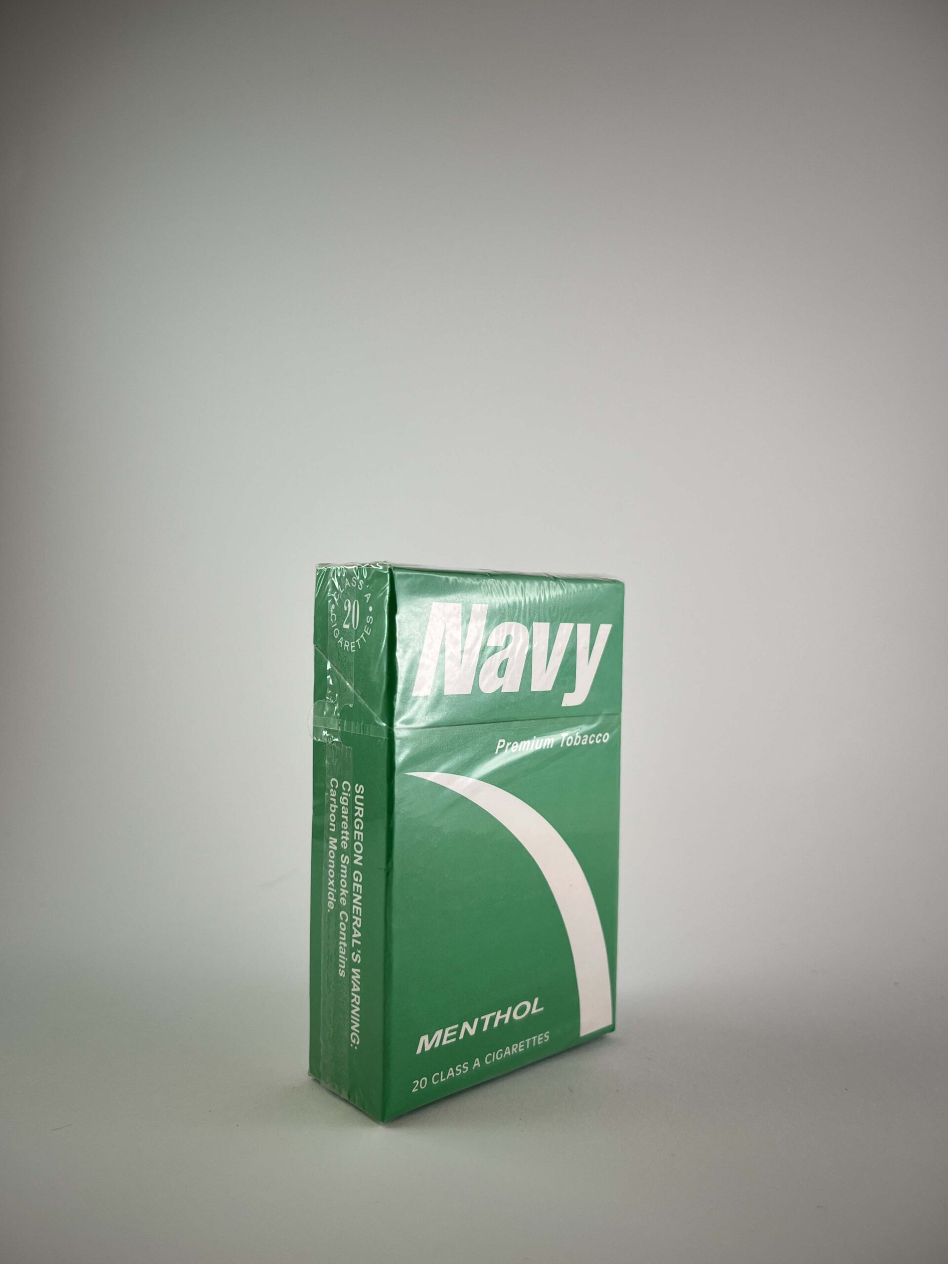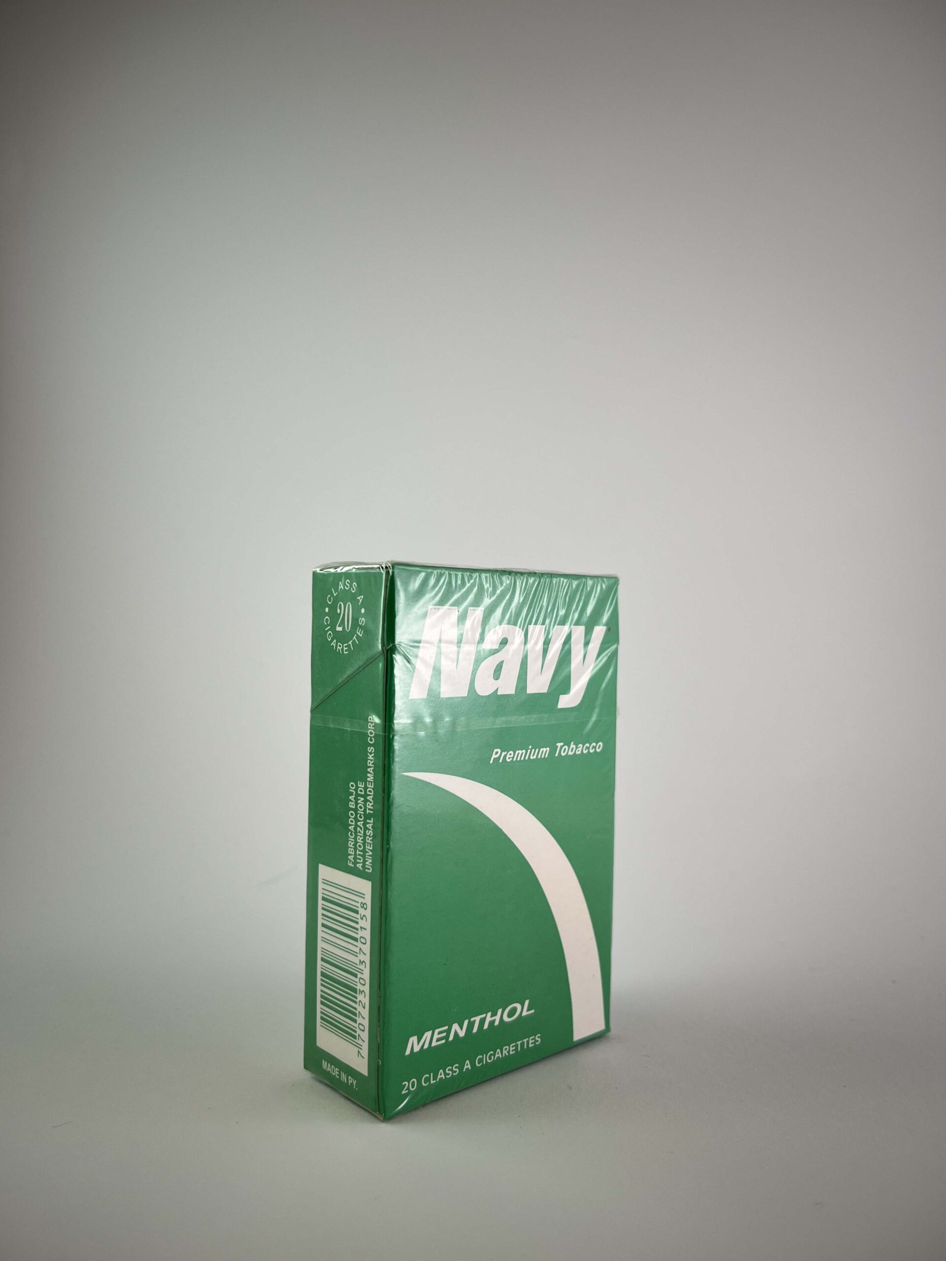 Description: „The Navy Menthol cigarette pack is bright green with a minimalist white design. It stands out for its simplicity and clear information about the menthol flavor. This brand aims to satisfy consumers who like a refreshing taste. The pack contains a warning about the harms of smoking, which is in English.