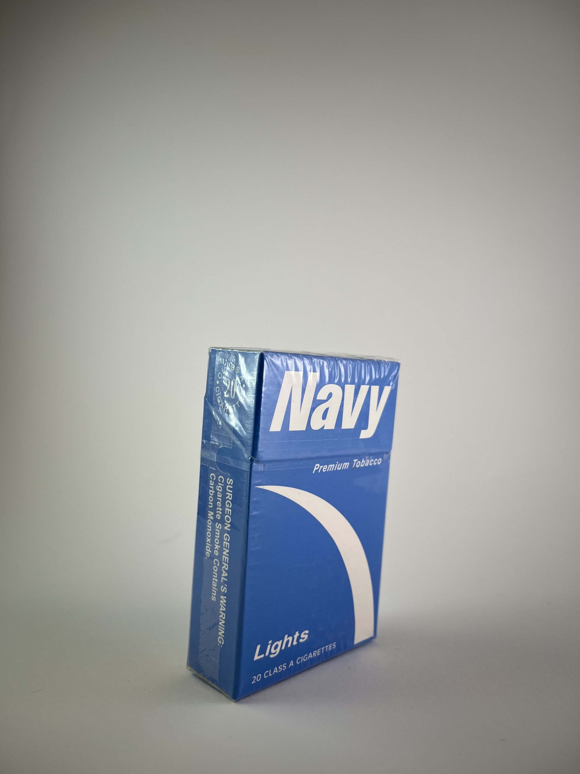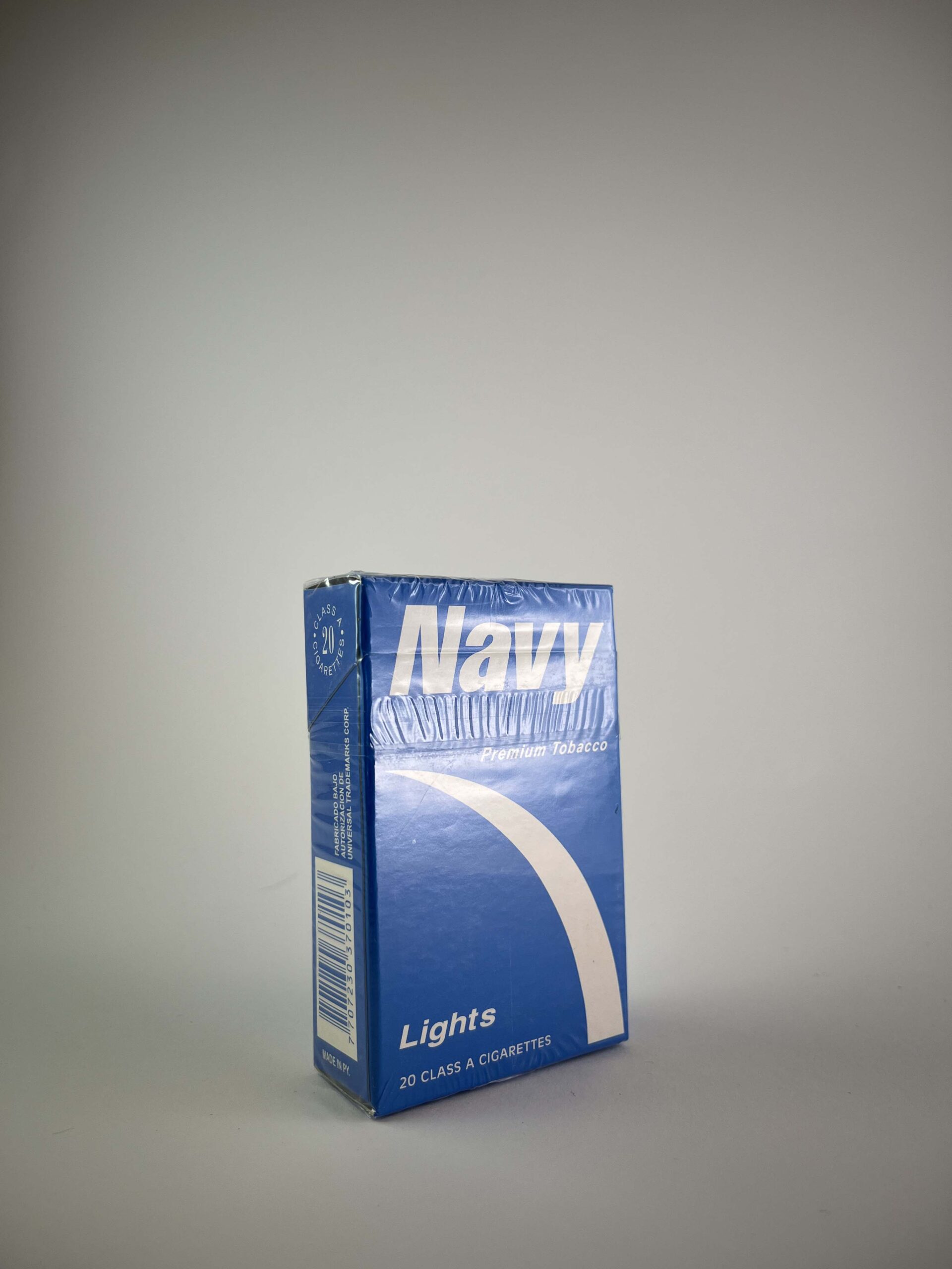 Description: The Navy Lights cigarette pack is blue in color with a simple and clear design. The pack highlights the brand name and uses a light color palette to emphasize the lighter feel of smoking. The side features a health warning message in English. The design appears to be aimed at the international market.