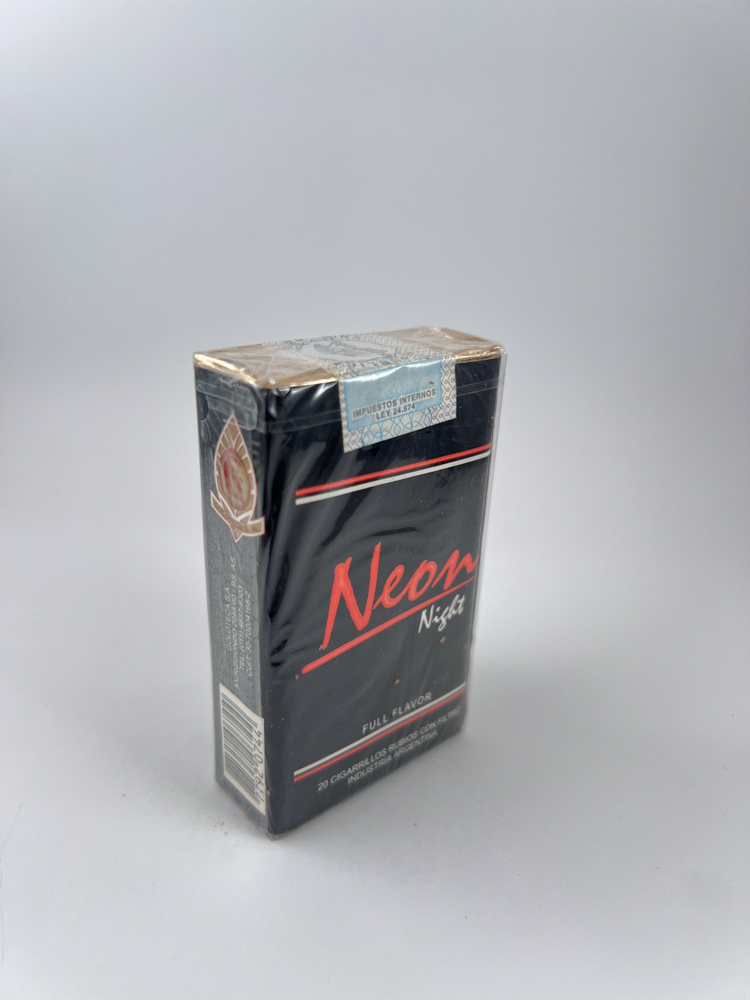 On top is a silver Argentine excise stamp „Impuestos Internos – Ley 24.674“, a typical labeling element of the period. Visually, this package conveys the spirit of a nocturnal aesthetic and a youthful character inspired by city life.