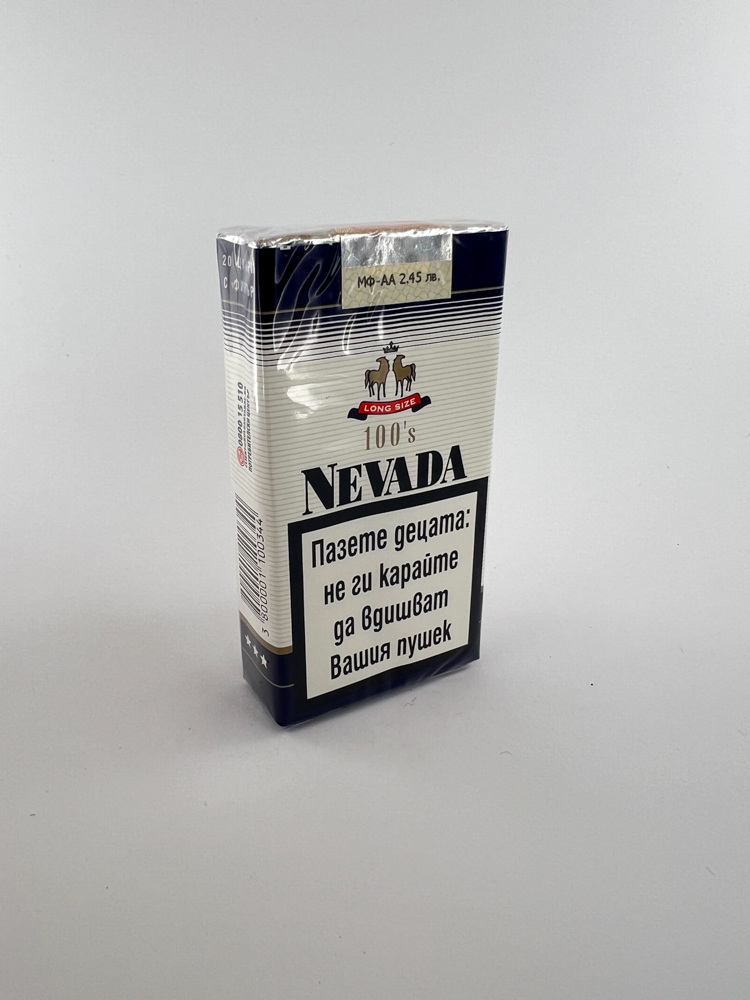 Description: This pack of Nevada cigarettes, marked as "100's" and "Long Size", is a combination of white and dark blue, with the inscription "Virginia Blend" in red. The top part features a crowned symbol of two deer, emphasizing the symbolism of the brand. The health warnings are in Bulgarian, and the state excise stamp with the price of 2.45 leva is visible at the top of the pack. This indicates that the pack was intended for the Bulgarian domestic market. The design is modest, but clear, focused on the traditional smoking segment.