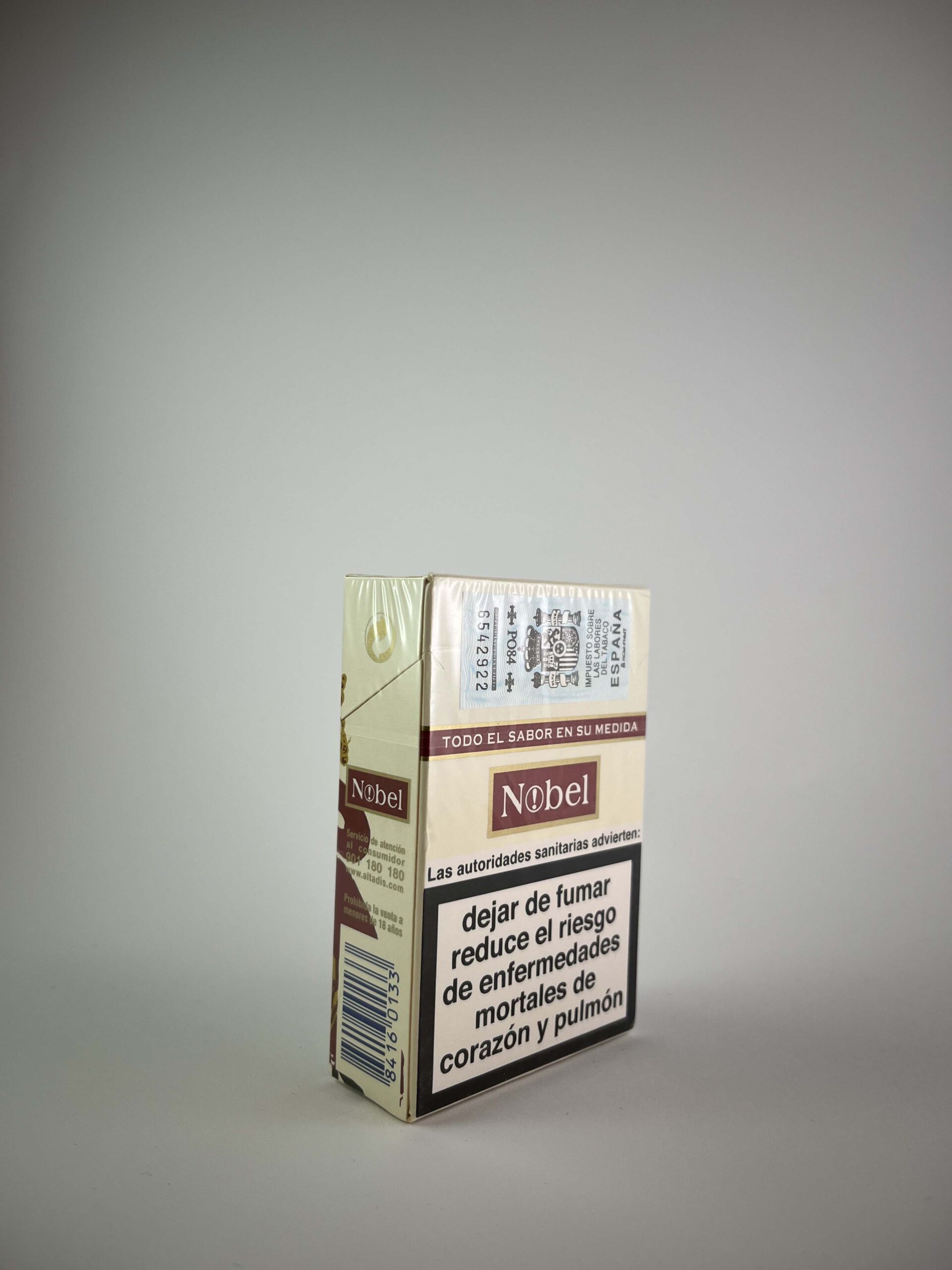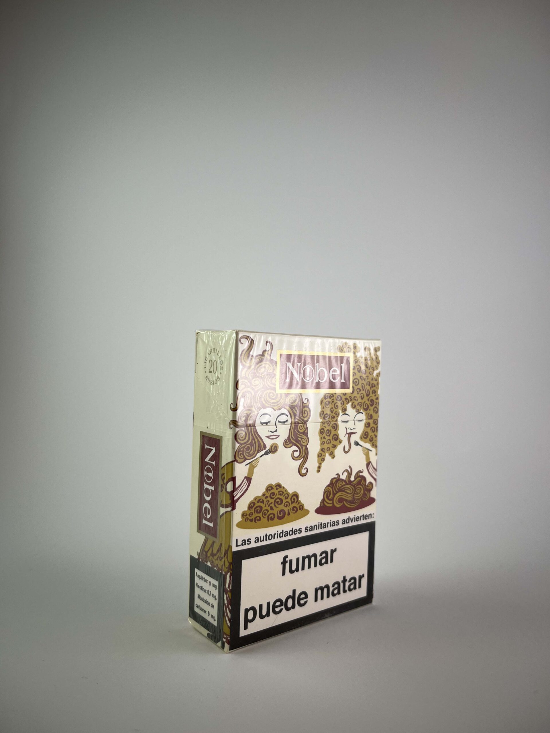Description: The Nobel Art Edition pack features a unique design, dominated by artistically stylized female portraits and subtle ornamental details. The packaging of this edition conveys an elegance and creativity that is not typical of standard tobacco packaging. The Nobel brand maintains its well-known position with a clear logo on the front and sides. The health warnings are presented in Spanish and occupy prominent positions, but they do not interfere with the visual uniqueness of the package.