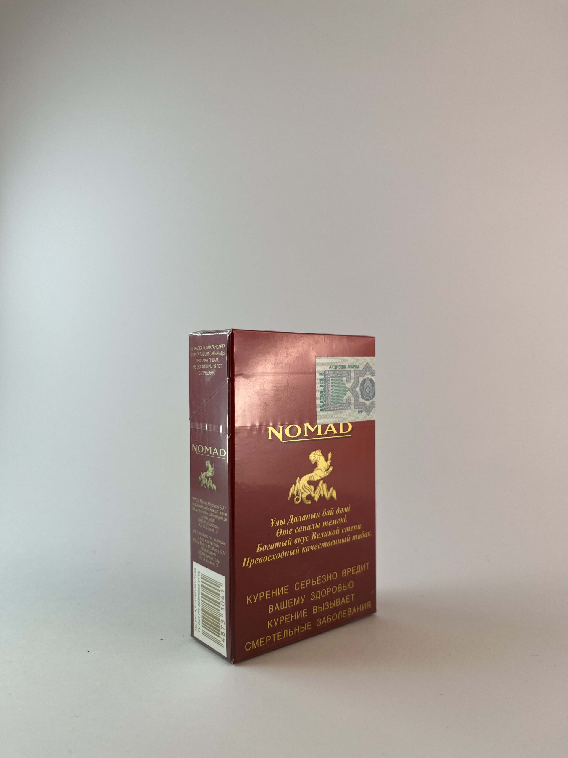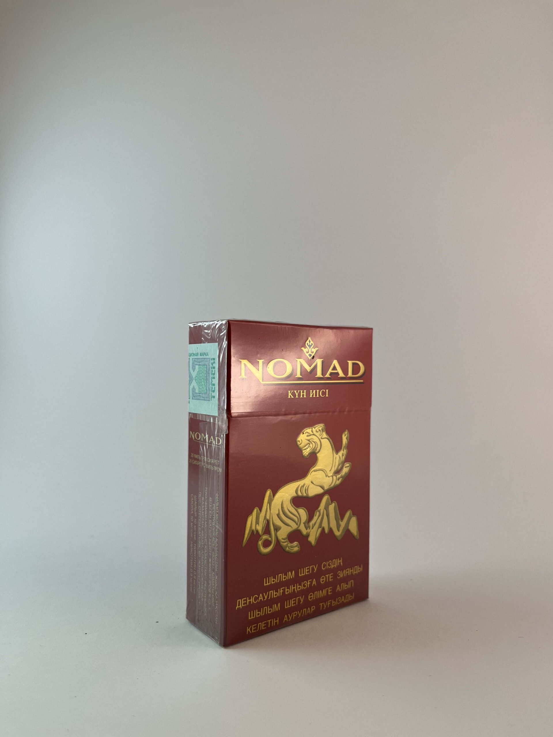 Description: The Nomad „Kun Isi” cigarette pack features a rich and exotic design with red and gold accents, conveying the spirit of nomads and the majestic steppes. In the middle of the pack, a golden horse is depicted, symbolizing strength and tradition. The pack carries a health warning in Kazakh and Russian, highlighting the health risks. This design is focused on the local market and reflects the cultural heritage of Central Asia.