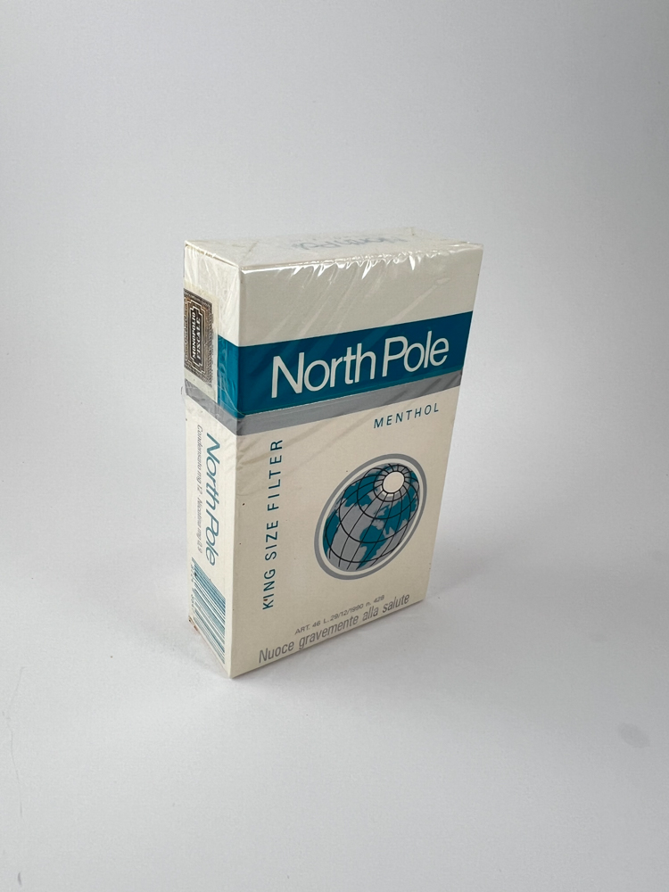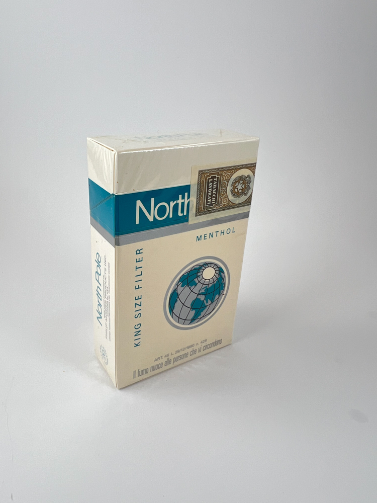 „North Pole Menthol is an Italian cigarette brand with a minimalist, clean design typical of Italian products from the late 1980s and early 1990s. The product was intended for the domestic market and export, and production was overseen by State Monopolies (state tobacco control authority), which is confirmed by an authentic stamp on the top.